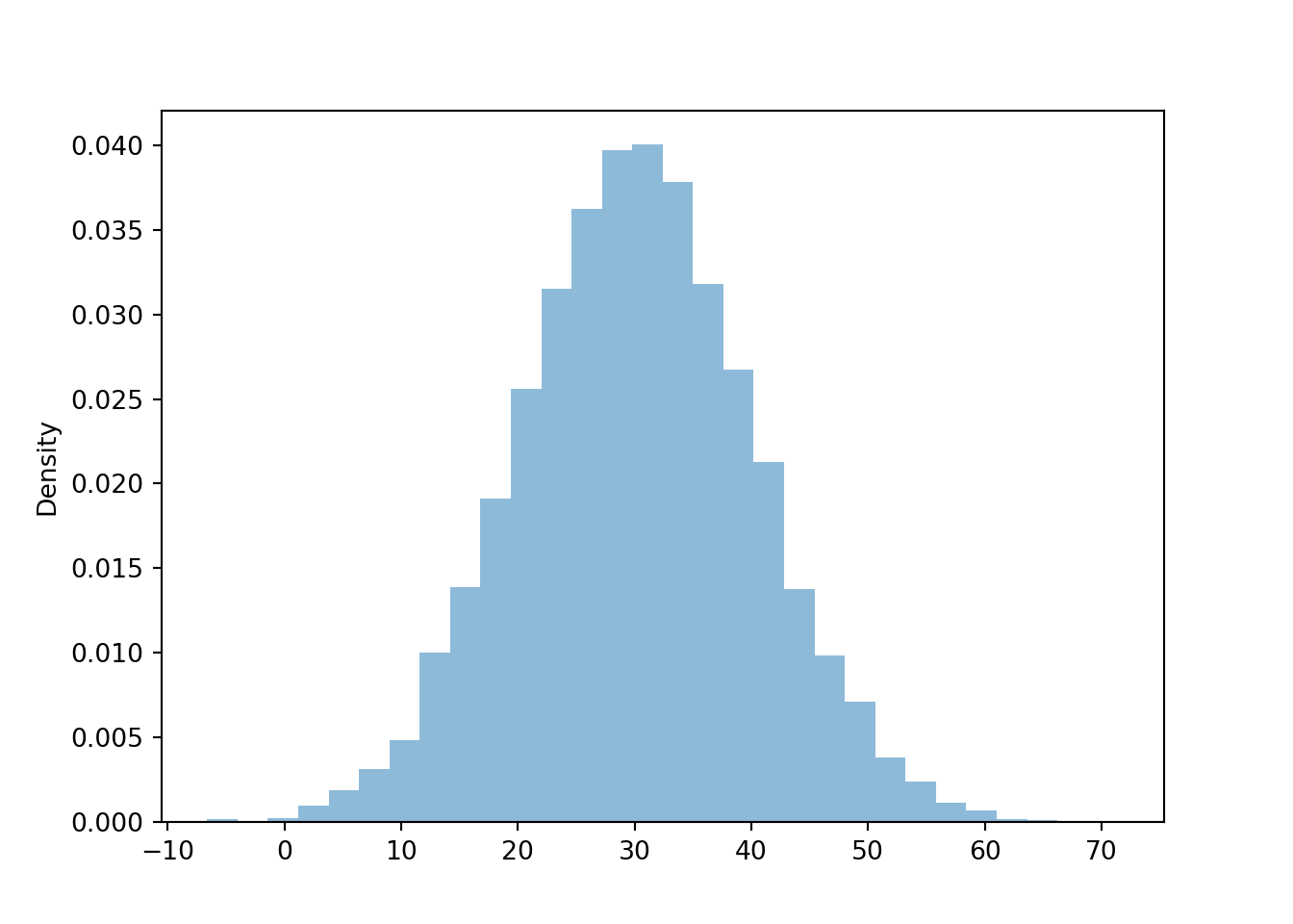 - See the simulation results below. The marginal distribution of \(Y\) is approximately Normal(30, 10).