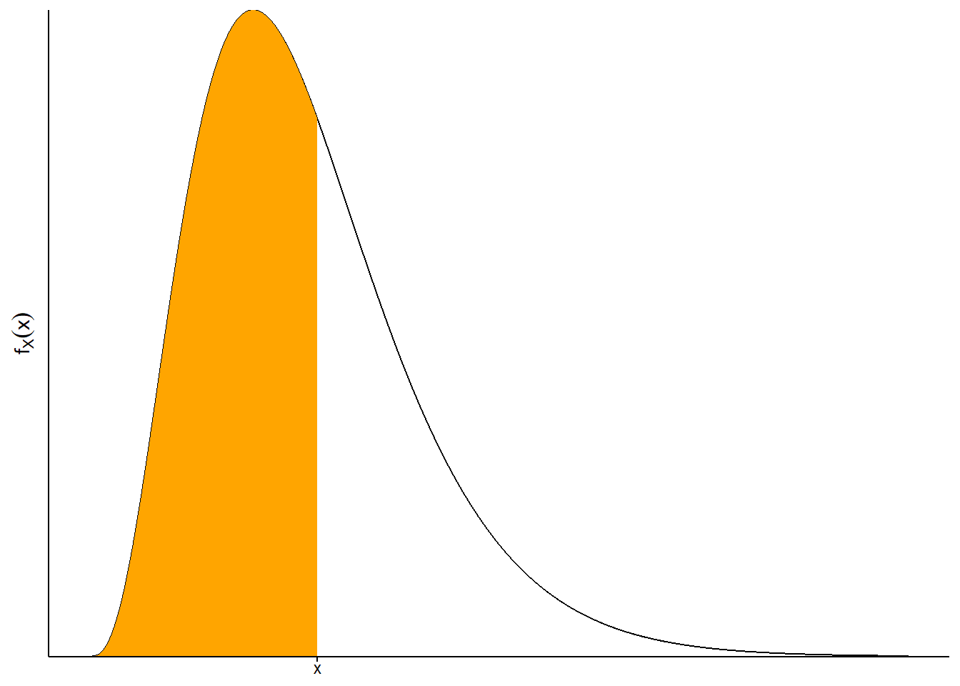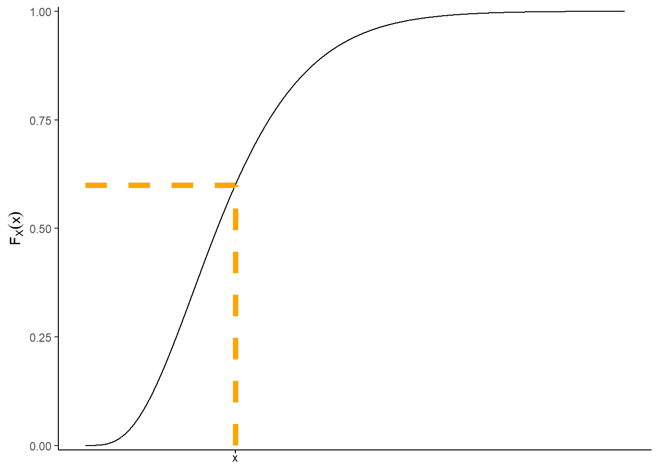 Roughly, the value \(x\) is the \(p\)th percentile of a distribution of a random variable \(X\) if \(p\) percent of values of the variable are less than or equal to \(x\): \(\textrm{P}(X\le x) = p\). The cumulative distribution function (cdf) of a random variable fills in the blank for any given \(x\): \(x\) is the (blank) percentile. That is, for an input \(x\), the cdf outputs \(\textrm{P}(X\le x)\).