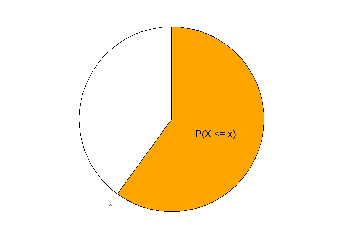 To understand a cdf, imagine a spinner for a particular distribution. Suppose a “second hand” starts at the smallest possible value (“12:00”) and sweeps clockwise around the spinner. The second hand sweeps out area as it goes; when the second hand is pointing at \(x\), the area that it has swept through represents \(\textrm{P}(X\le x)\). The cdf records the values of \(F_X(x) = \textrm{P}(X\le x)\) as the second hand moves along and points to different values of \(x\).