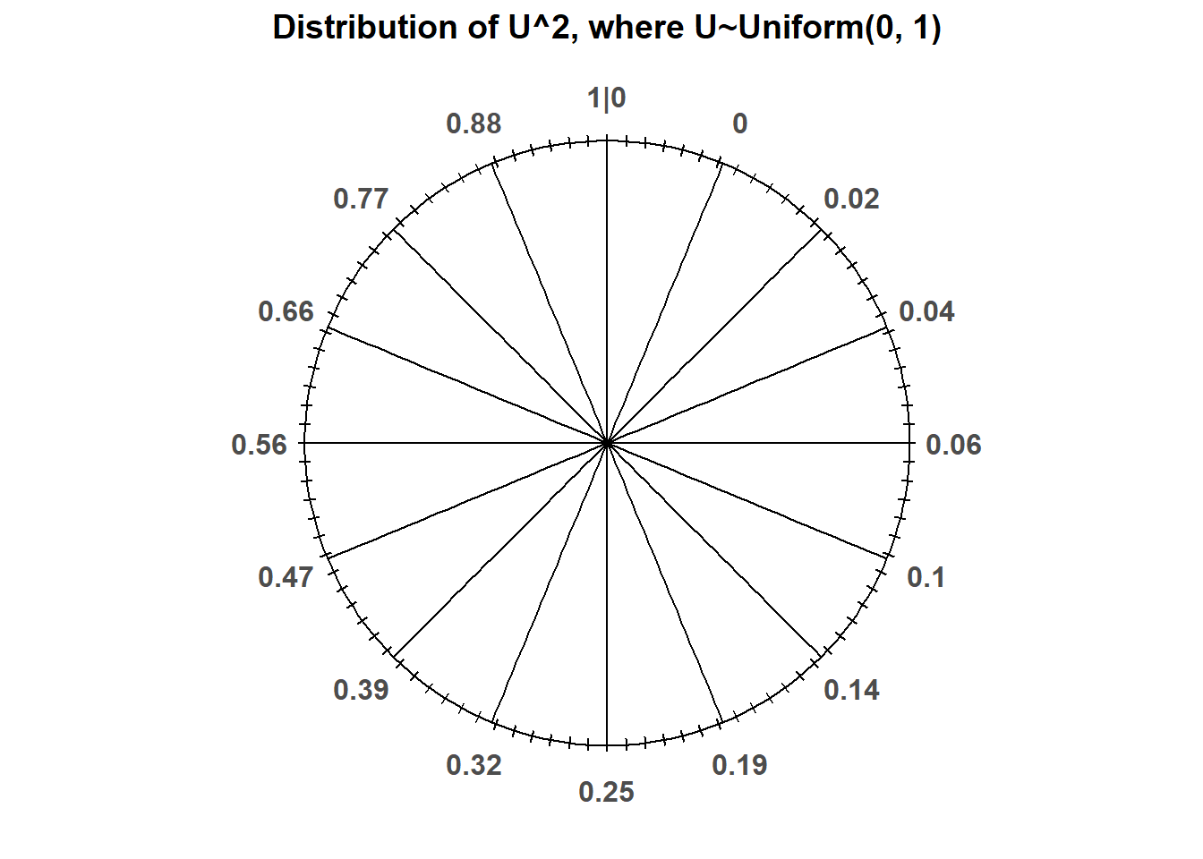 We see that \(U^2\) is more likely to be near 0 than near 1. Squaring numbers between 0 and 1 makes “pushes” them towards \(0.5^2 = 0.25\), \(0.1^2 = 0.01\), etc. The following spinner corresponds to the distribution approximated by the histogram above.
