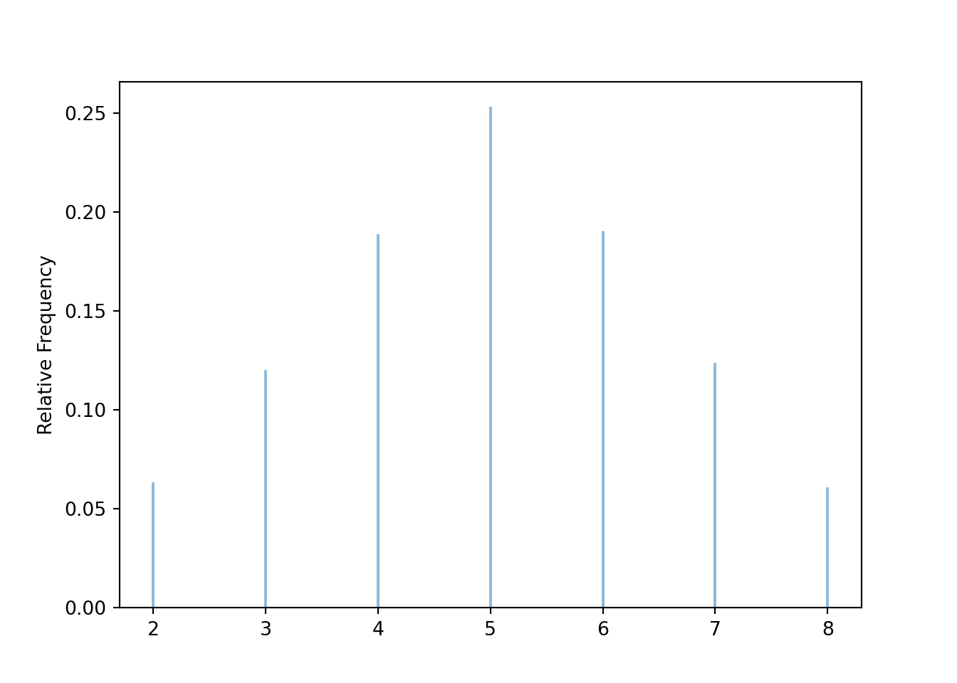 X = RV(BoxModel([2, 3, 4, 5, 6, 7, 8], probs = [1 / 16, 2 / 16, 3 / 16, 4 / 16, 3 / 16, 2 / 16, 1 / 16]))