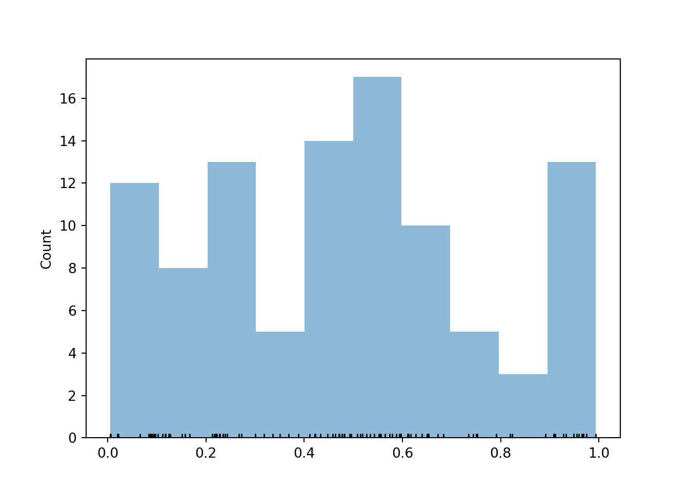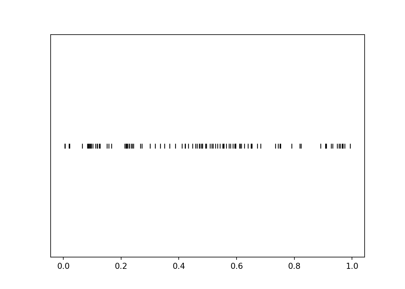 - then computing relative frequencies involving the simulated values of the random variable to approximate probabilities of events involving the random variable (e.g., \(\textrm{P}(X\le x)\)).