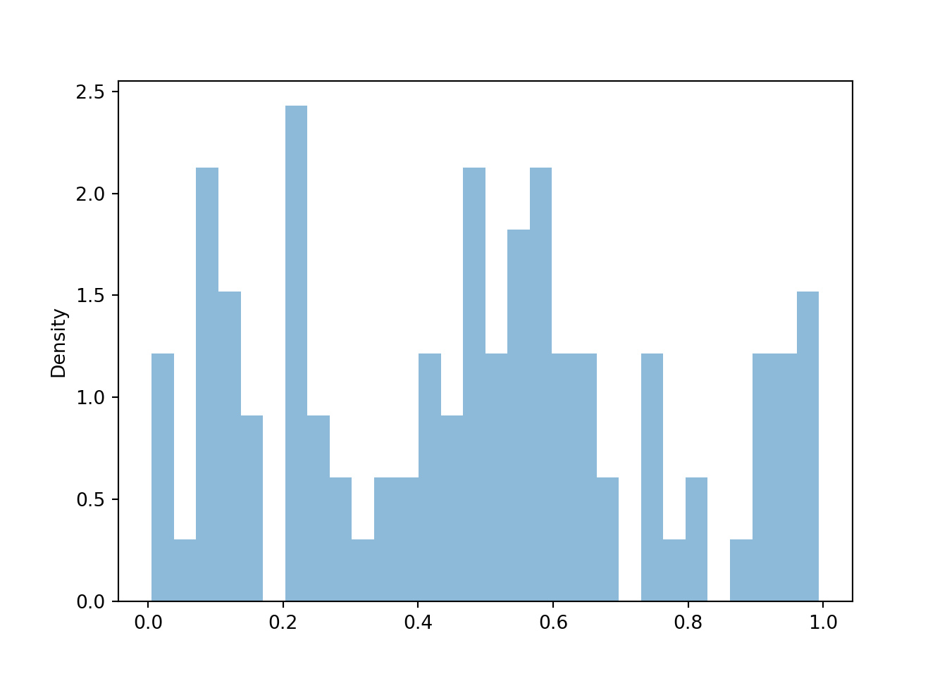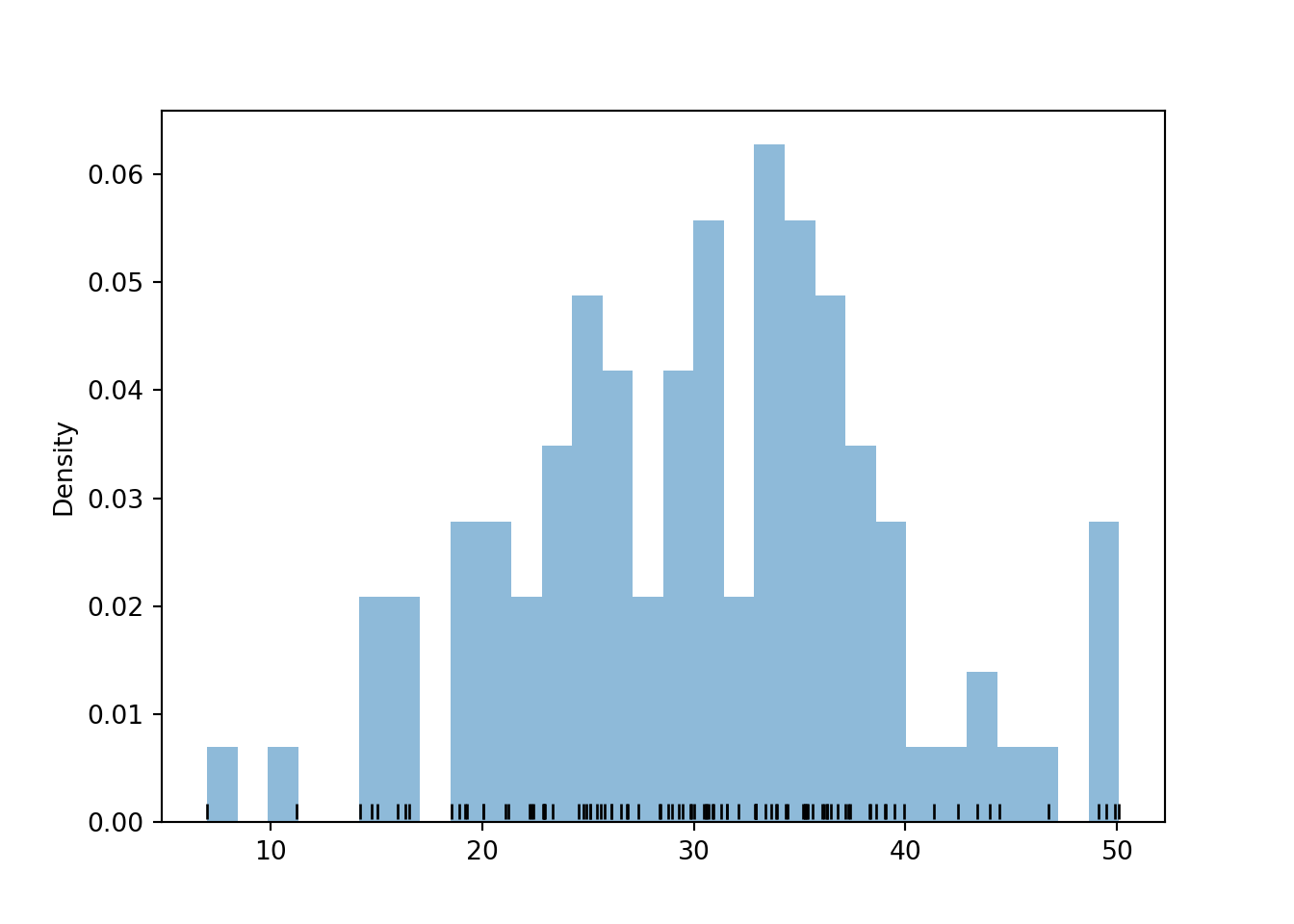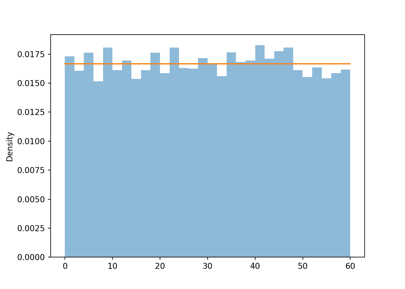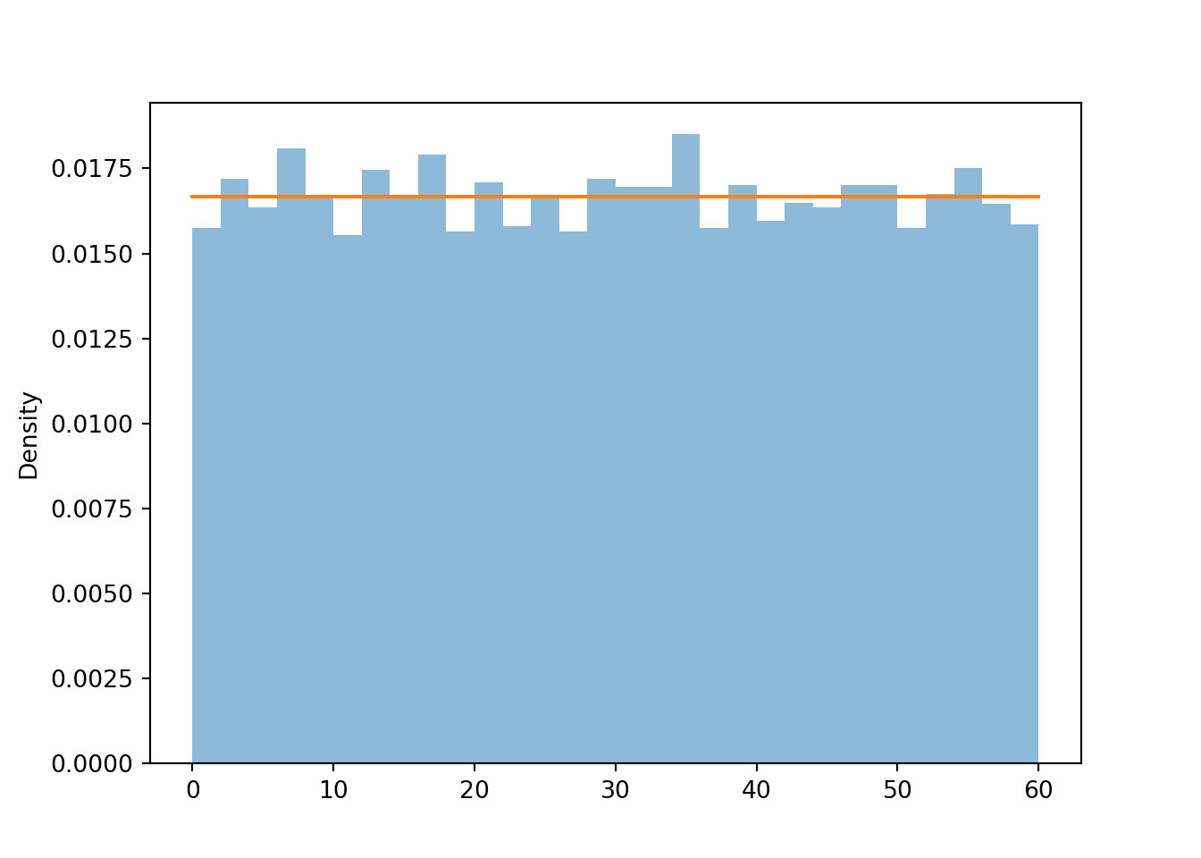 Plotting the values, we see that values near 30 occur more frequently than those near 0 or 60. The histogram is not “flat” like in the Uniform case.