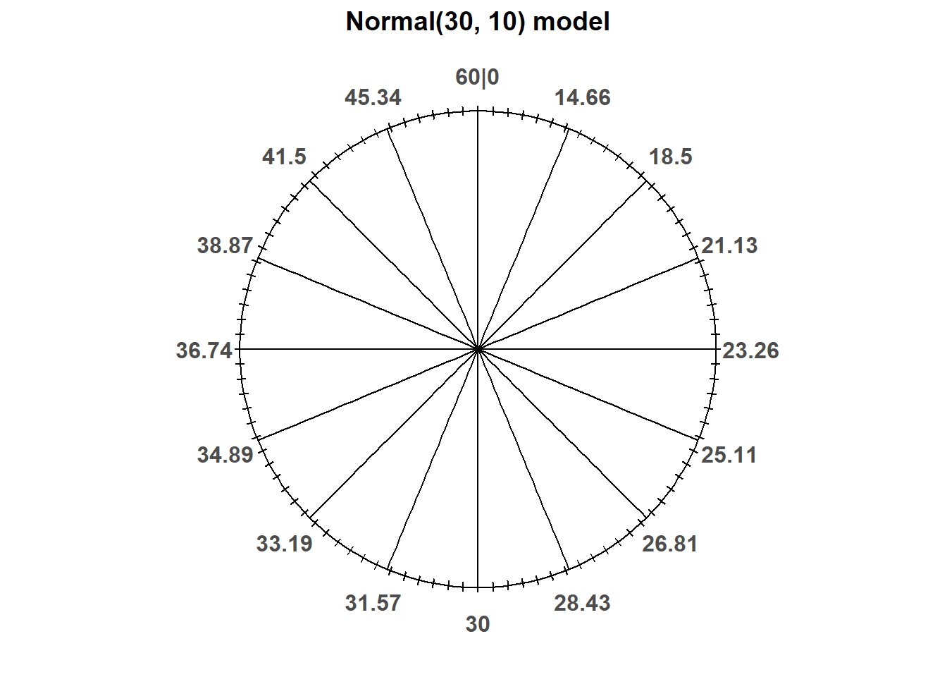 Continuing in this way we can fill in the rest of the axis labels on the Normal(30, 10) spinner. For example, Normal(30, 10).quantile(0.854) tells us the value that should go 85.4% of the way around the spinner axis (at “10:15”).