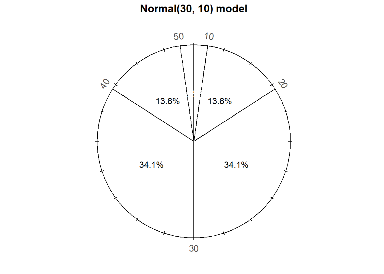 And so on. We could compute percentages for other intervals by measuring the areas of corresponding sectors on the spinner to complete the pattern of variability that values resulting from this spinner would follow. This particular pattern is called a “Normal(30, 10)” distribution.