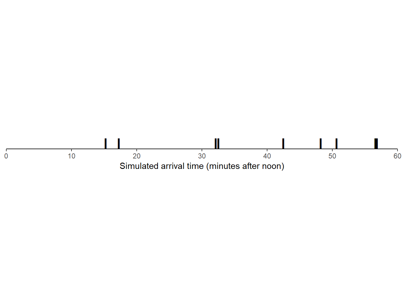 If we plot the 10 simulated values along a number line, we tend to see more values near 30 than near 0 or 60. (Again, it’s hard to discern any patterns with only 10 values.)