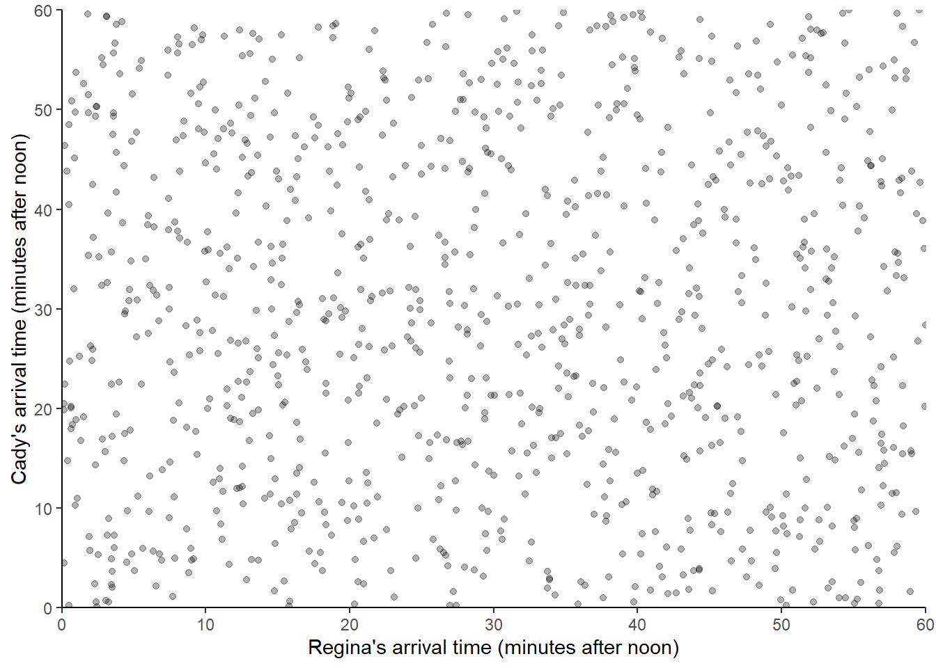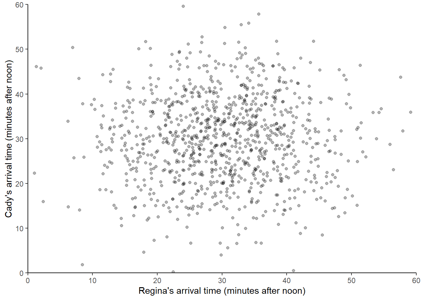 Now suppose we keep repeating the process, resulting in many simulated (Regina, Cady) pairs of arrival times. The following displays 1000 simulated pairs of (Regina, Cady) arrival times, resulting from 1000 pairs of spins of the Uniform(0, 60) spinner.