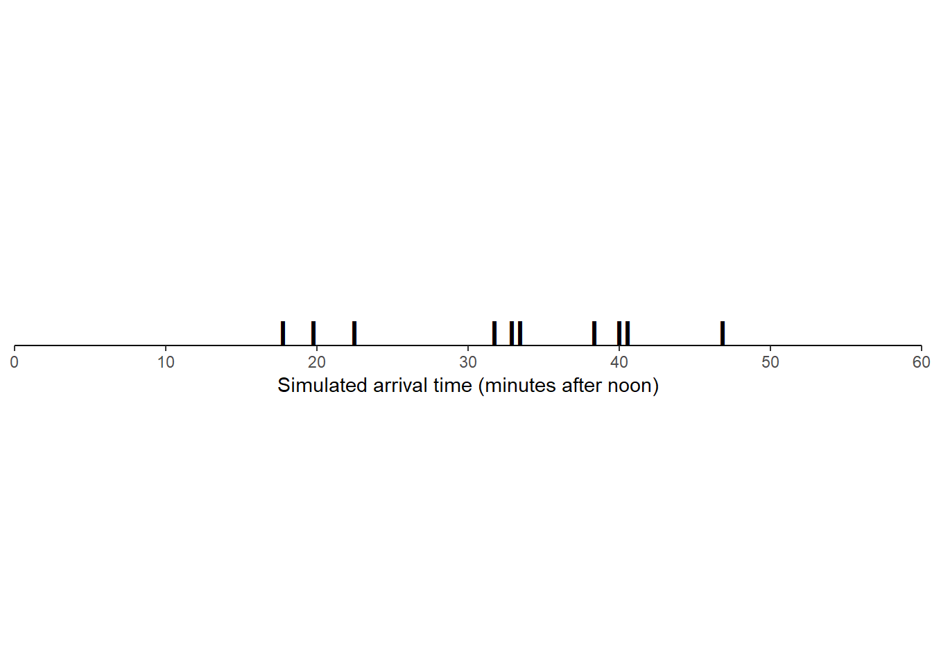 If we plot the 10 simulated values along a number line, they are roughly evenly spaced, though there is some natural variability. (Though it’s hard to discern any patterns with only 10 values.)
