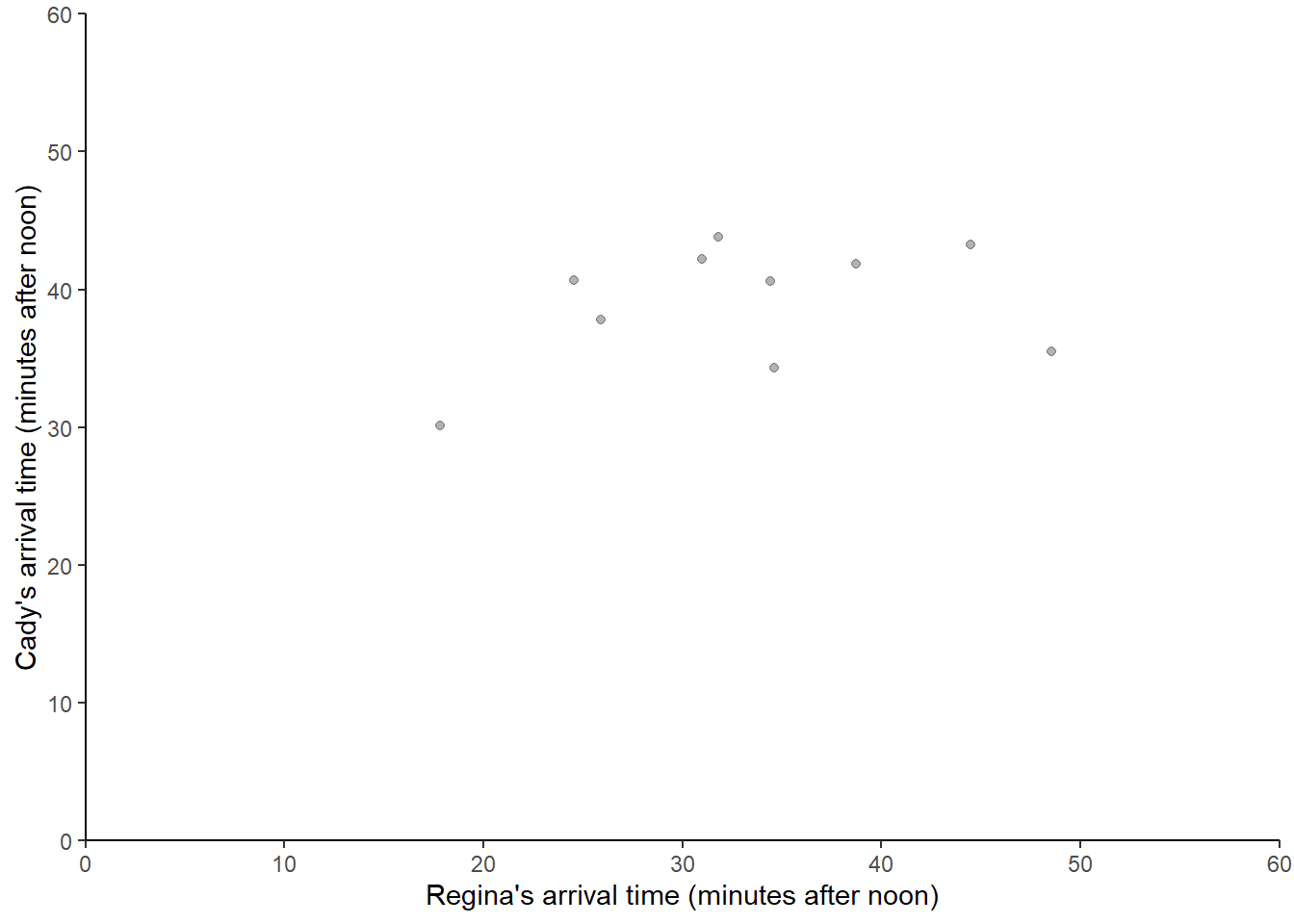 Regina’s and Cady’s arrival times are each reasonably modeled by a Normal(30, 10) model, independently of each other. To simulate a (Regina, Cady) pair of arrival times, we would spin the Normal(30, 10) spinner twice. The following displays the results of 10 repetitions, each repetition resulting in a (Regina, Cady) pair.