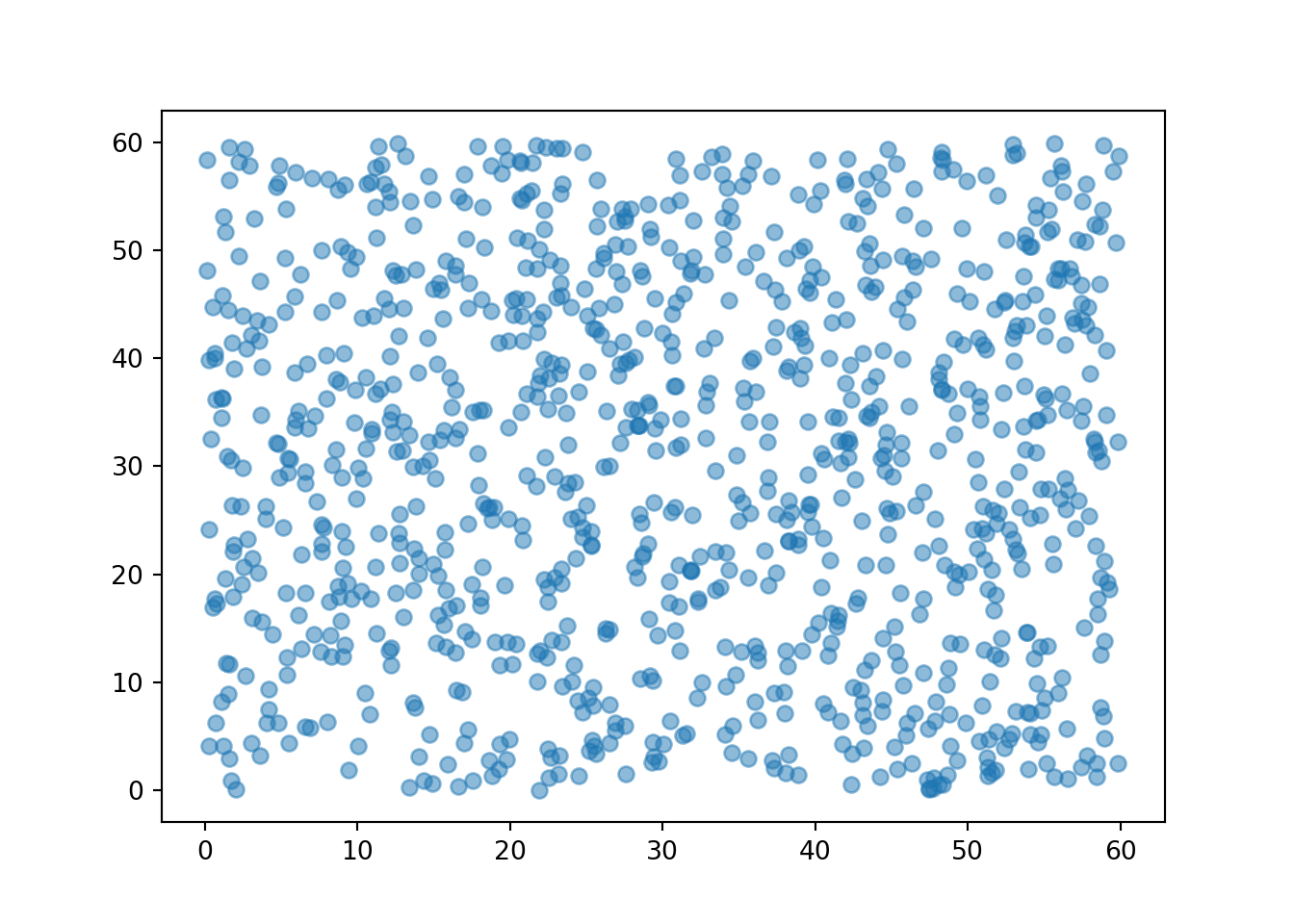 We see that the pairs are fairly evenly distributed throughout the square with sides [0, 60] representing the sample space. If we simulated more values and summarized them in an appropriate plot, we would expect to see something like Figure 2.7.