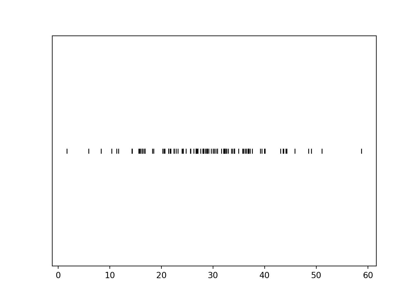 R, Y = RV(P)Again, we can simulate values and plot them. Compared to the rug plot based on the Uniform model, the rug plot based on the Normal model shows that more simulated \(R\) values tend to be close to 30 than near 0 or 60.