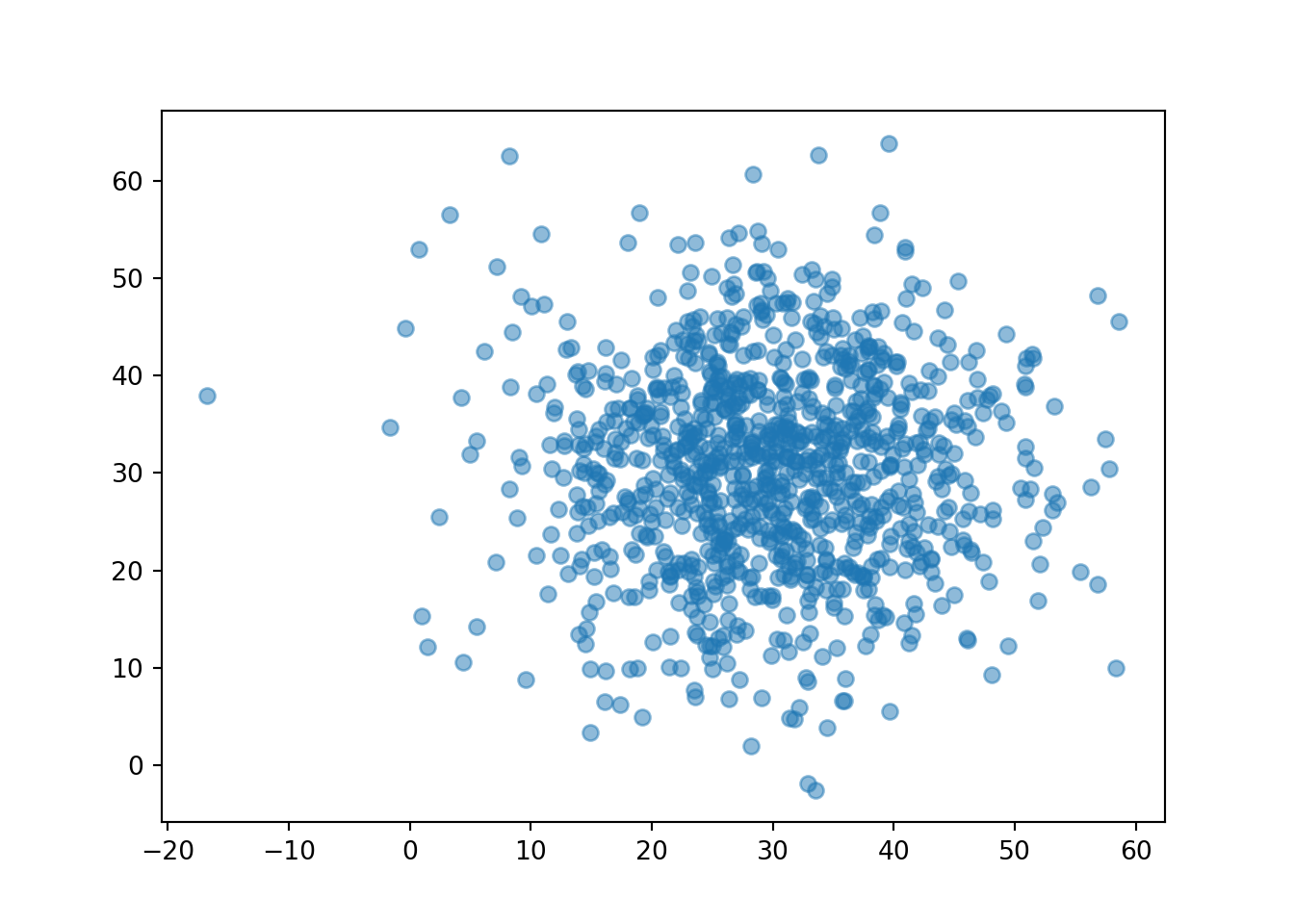 We see that more pairs are located near (30, 30), similar to Figure 2.10. (We also might see some values outside of [0, 60].)