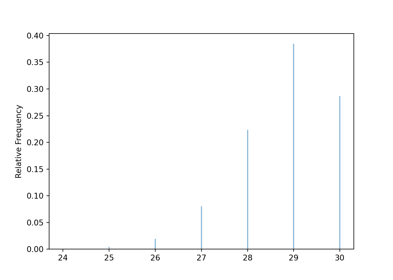 In the simulation below, the random variable \(X\) measures the number of distinct birthdays among the 30 people. So if no one shares a birthday then \(X=30\), if exactly two people share a birthday then \(X=29\), and so on.
