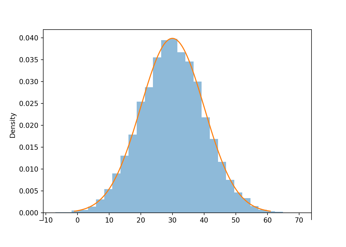 RV(Normal(30, 10)).sim(10000).plot() # plot simulated values