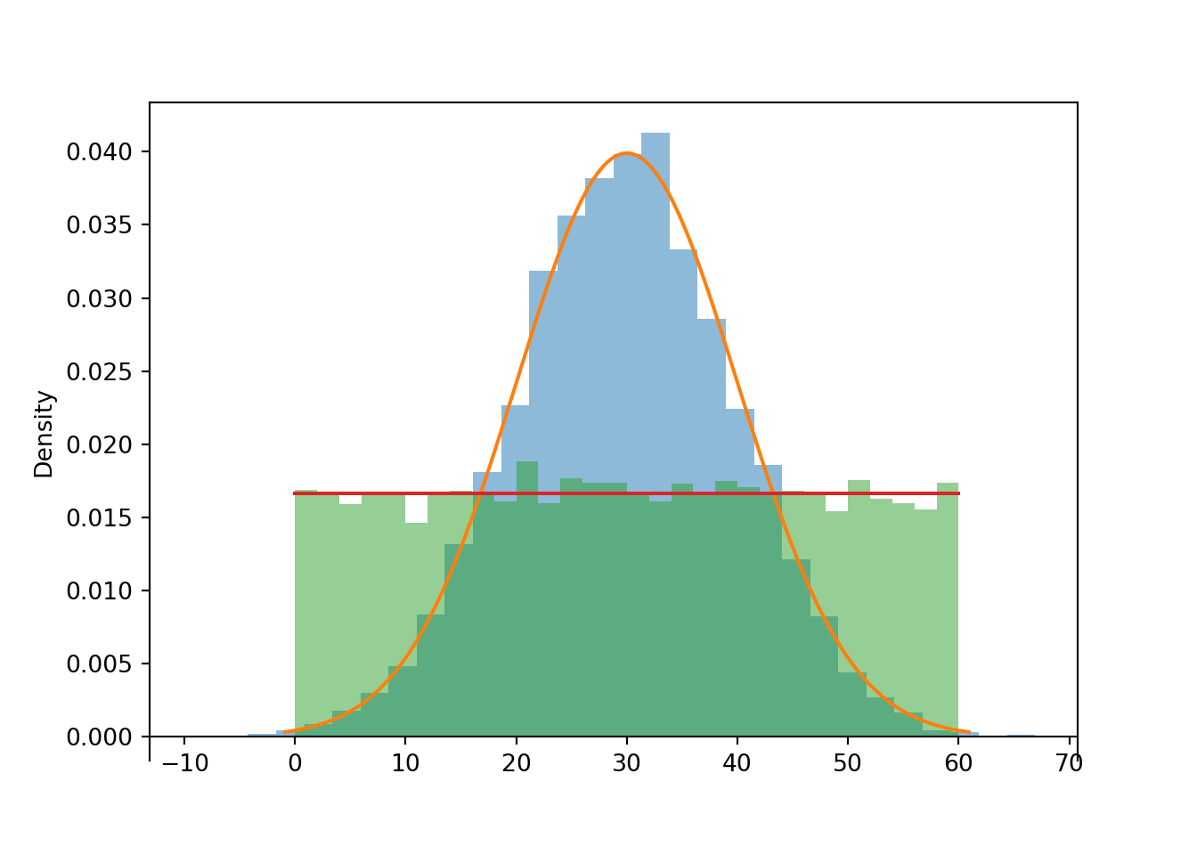 Example 2.52 We’ll compare long run average and standard deviation for the Uniform(0, 60) distribution and the Normal(30, 10) distribution.