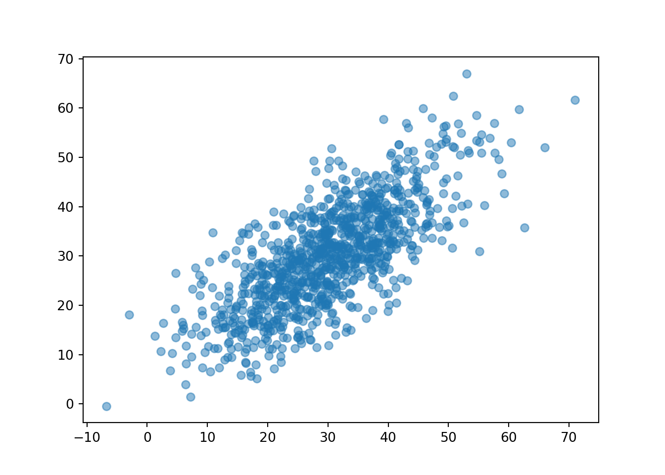 R, Y = RV(BivariateNormal(mean1 = 30, sd1 = 10, mean2 = 30, sd2 = 10, corr = 0.7))