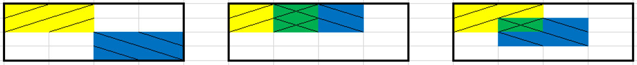 Example 12.1 Each of the three Venn diagrams below represents a sample space with 16 equally likely outcomes. Let \(A\) be the yellow / event, \(B\) the blue \ event, and their intersection \(A\cap B\) the green \(\times\) event. Suppose that areas represent probabilities, so that for example \(\text{P}(A) = 4/16\).