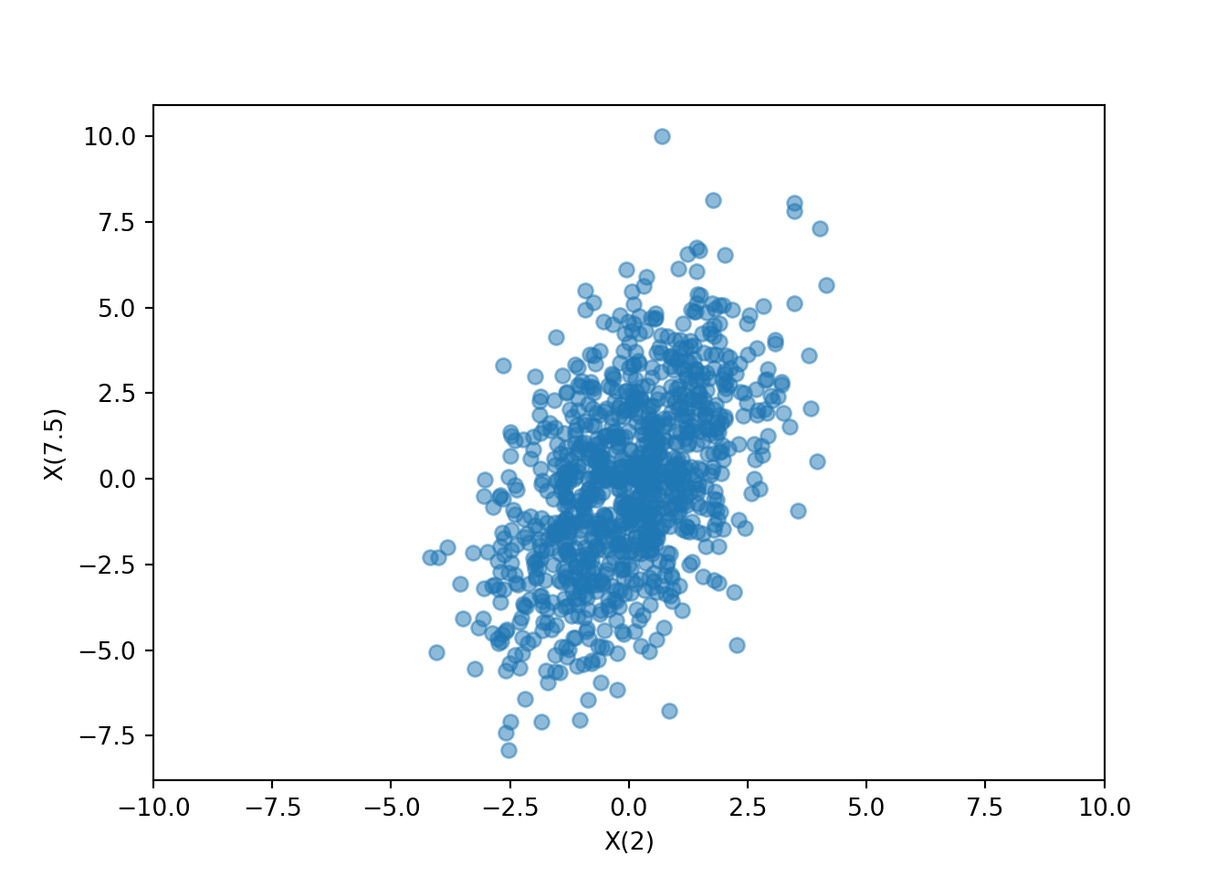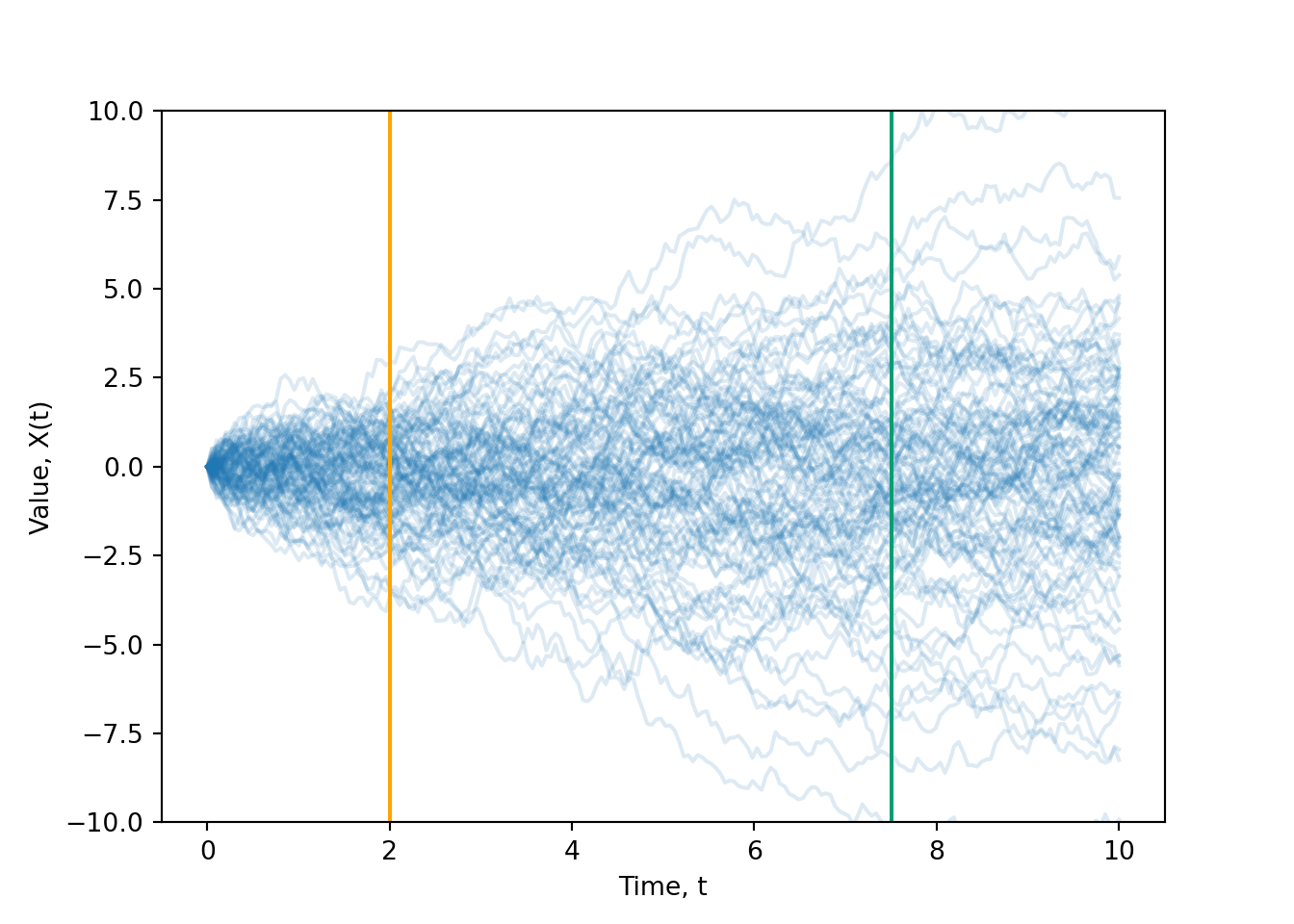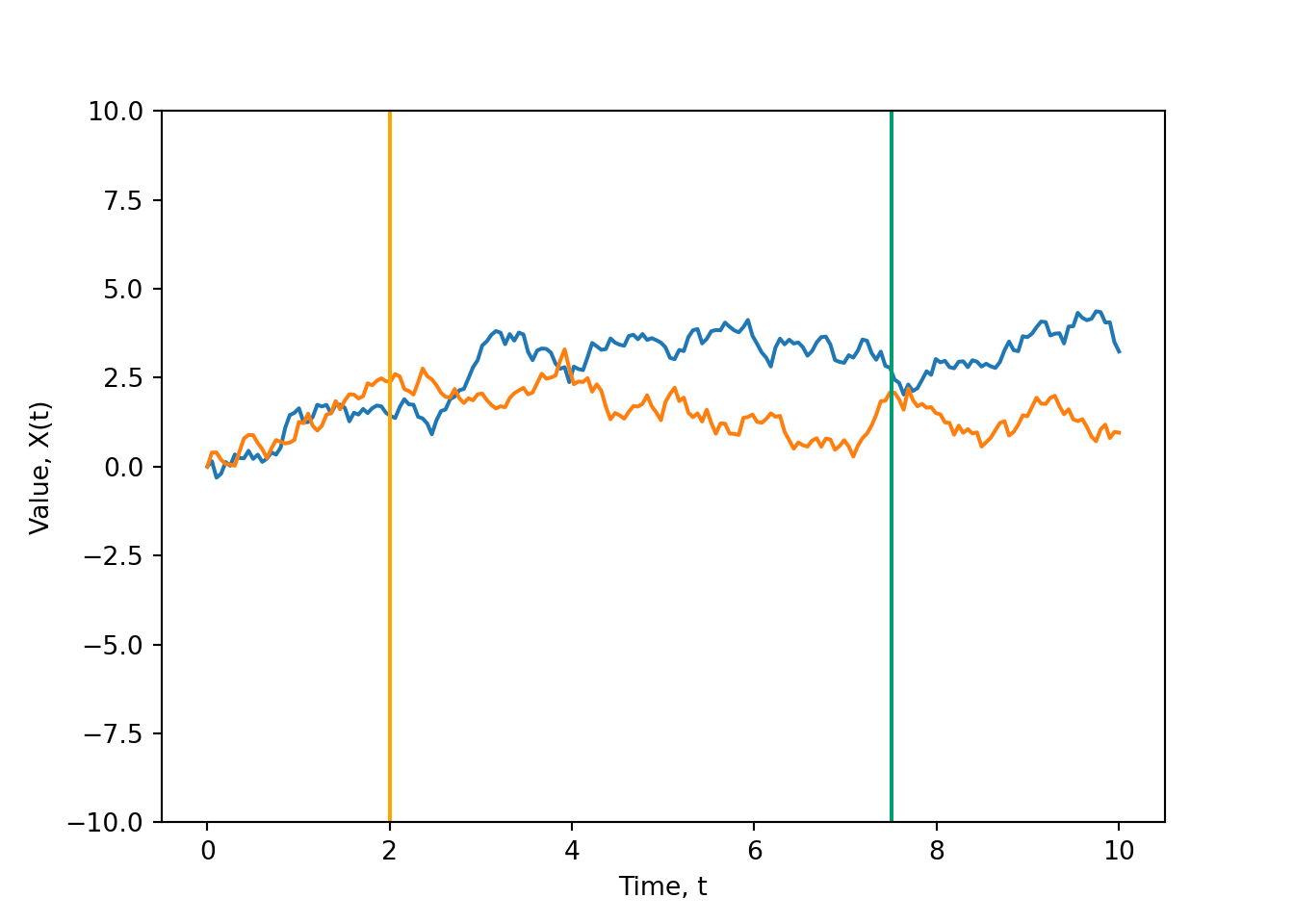 - The process values \(X(t)\) and \(X(s)\) at any two points in time, \(s\) and \(t\), have a joint distribution.