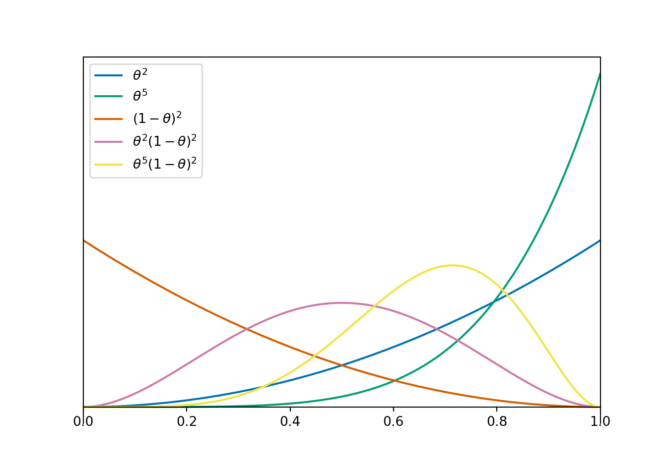 - proportional to \(\theta^5,\; 0<\theta<1\).