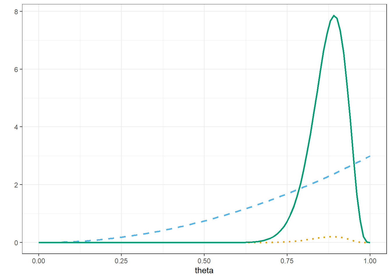 The Beta(3, 1) prior is proportional to \[ \pi(\theta) \propto \theta^{3 - 1}(1-\theta)^{1-1}, \qquad 0 < \theta < 1. \]
