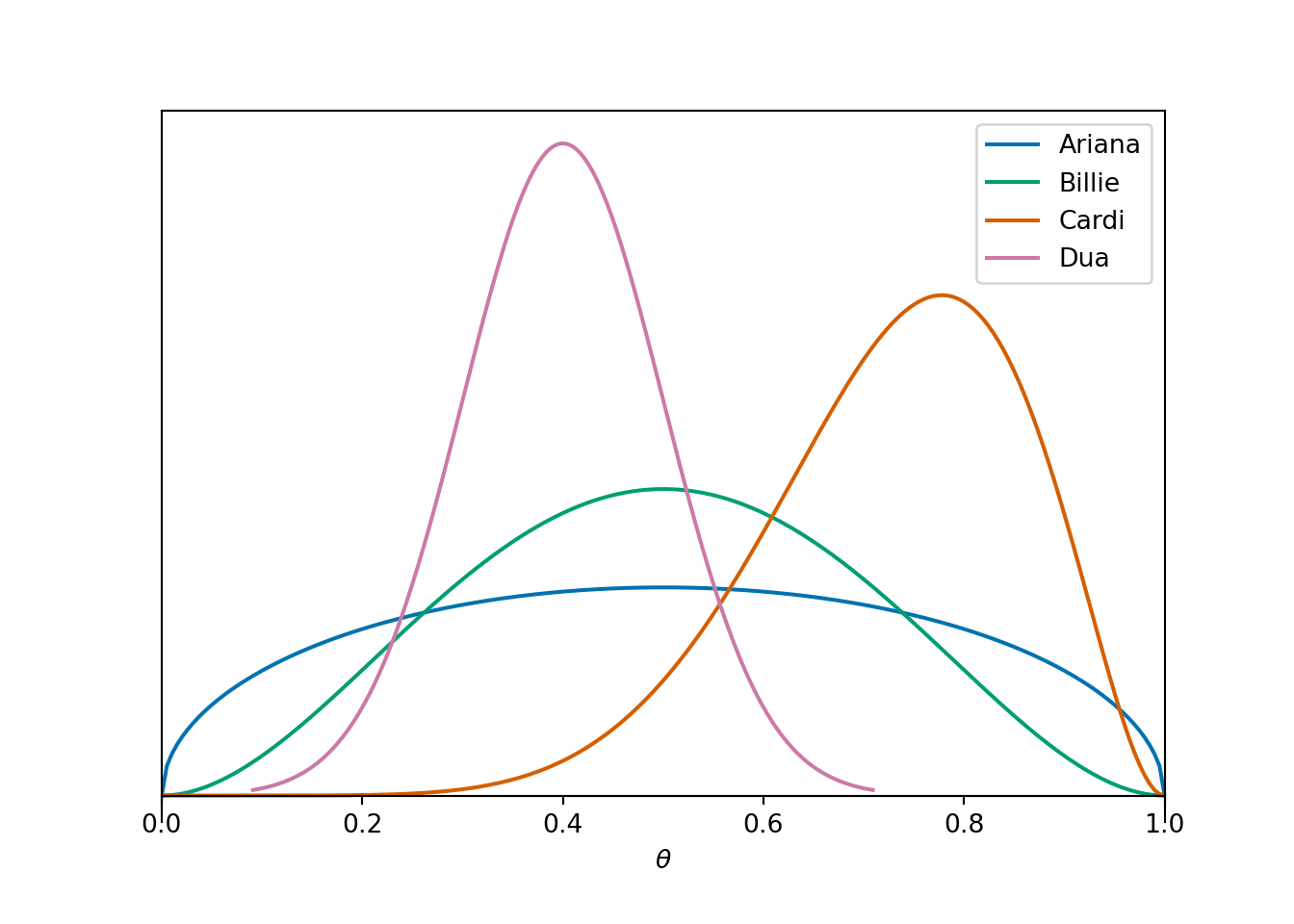 - Rank the students in terms of their uncertainty about \(\theta\). Who is the most uncertain? The least?