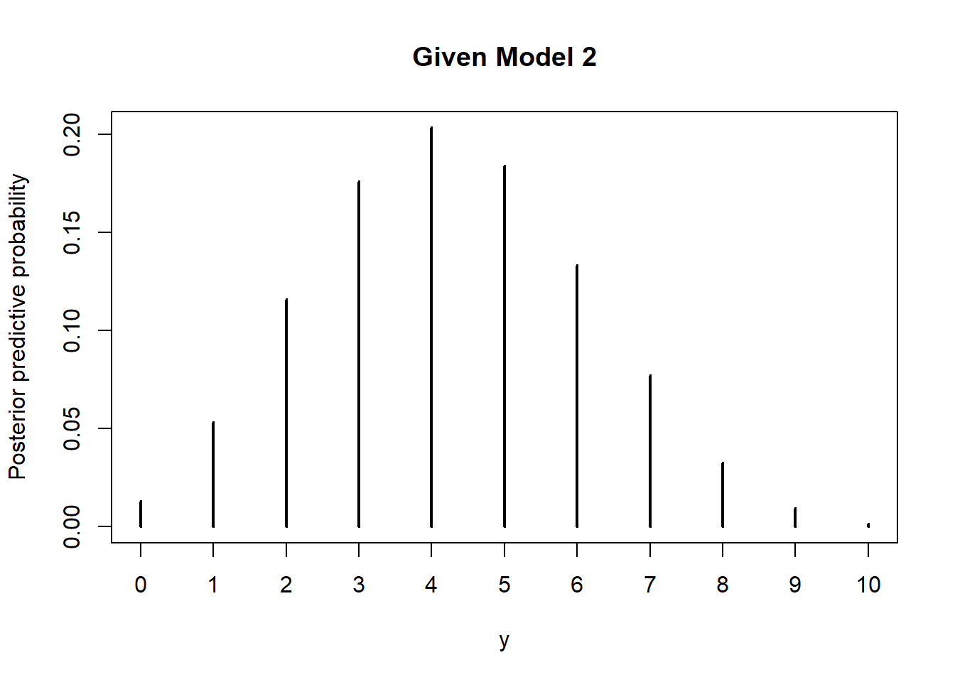 Use simulation to approximate the posterior predictive distribution of the number of heads in the next 10 flips given 6 heads in the first 10 flips given that model 2 is the correct model. In particular, approximate the posterior predictive probability that there are 7 heads in the next 10 flips given then model 2 is the correct model.