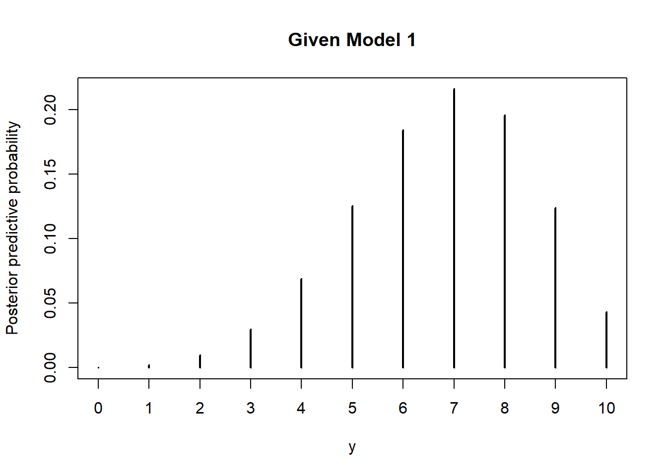 Suppose our prior probability for each model was 0.5. Use simulation to approximate the posterior predictive distribution of the number of heads in the next 10 flips given 6 heads in the first 10 flips. In particular, approximate the posterior predictive probability that there are 7 heads in the next 10 flips.