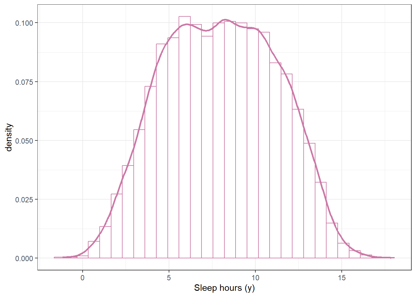 Suppose we want to perform a Bayesian analysis to estimate \(\theta\), the population mean hours of sleep on a typical weeknight for Cal Poly students. Assume that sleep hours for individual students follow a Normal distribution with unknown mean \(\theta\) and known standard deviation \(\sigma=\) 1.5 hours. (Known population SD is an unrealistic assumption that we use for simplicity here.) Suppose we want to “let the data speak for itself” so we choose a flat, Uniform prior1. Our Uniform prior needs an upper and lower bound. We remember that we shouldn’t assign 0 prior probability to possible values, no matter how implausible, so we pick a fairly wide range of possible values for \(\theta\), namely Uniform on [3, 13]. Use simulation to approximate the prior predictive distribution of sleep hours according to our model.