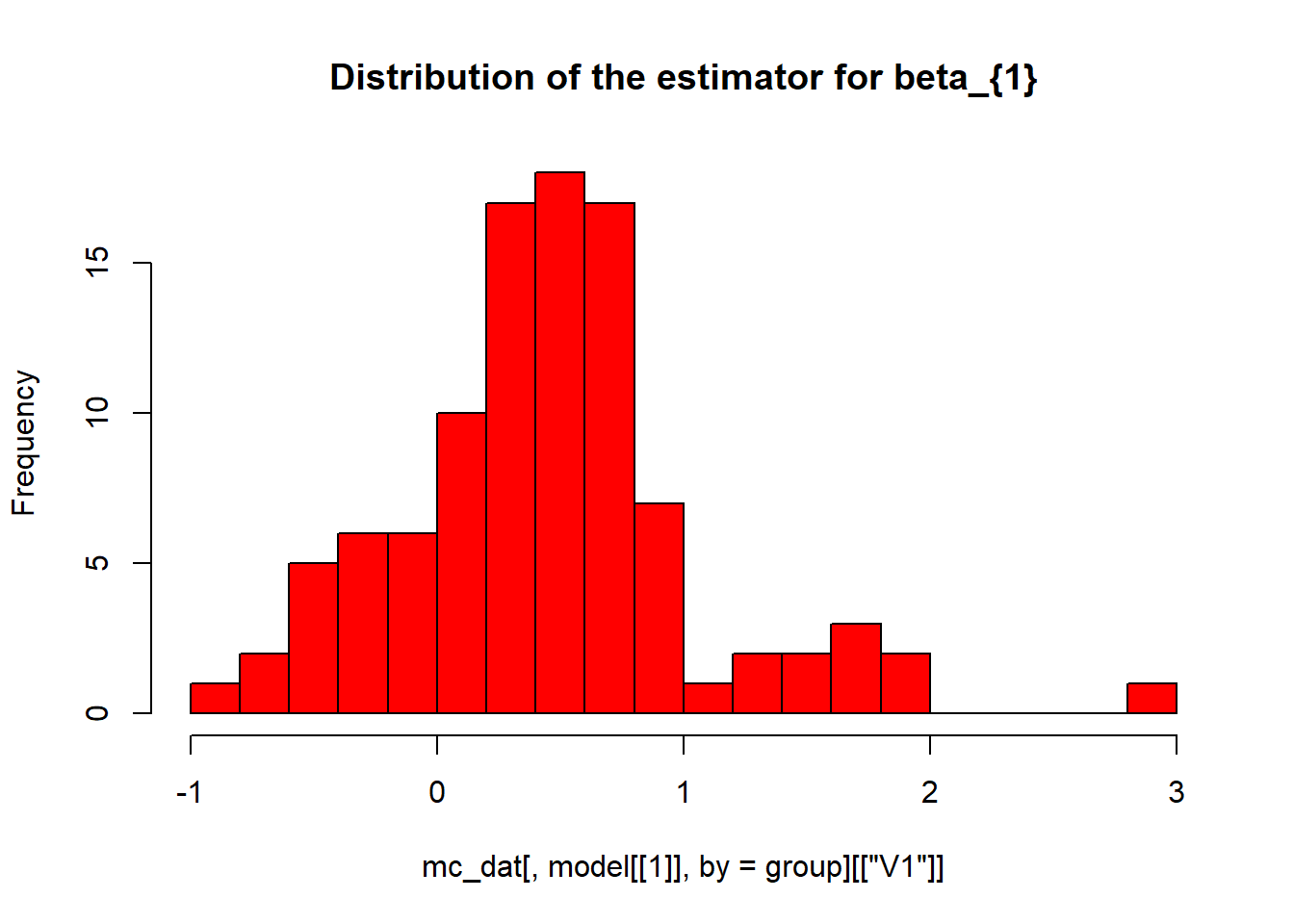 hist(mc_dat[,model[[1]], by=group][["V1"]], breaks=25, col="red", main="Distribution of the estimator for beta_{1}")