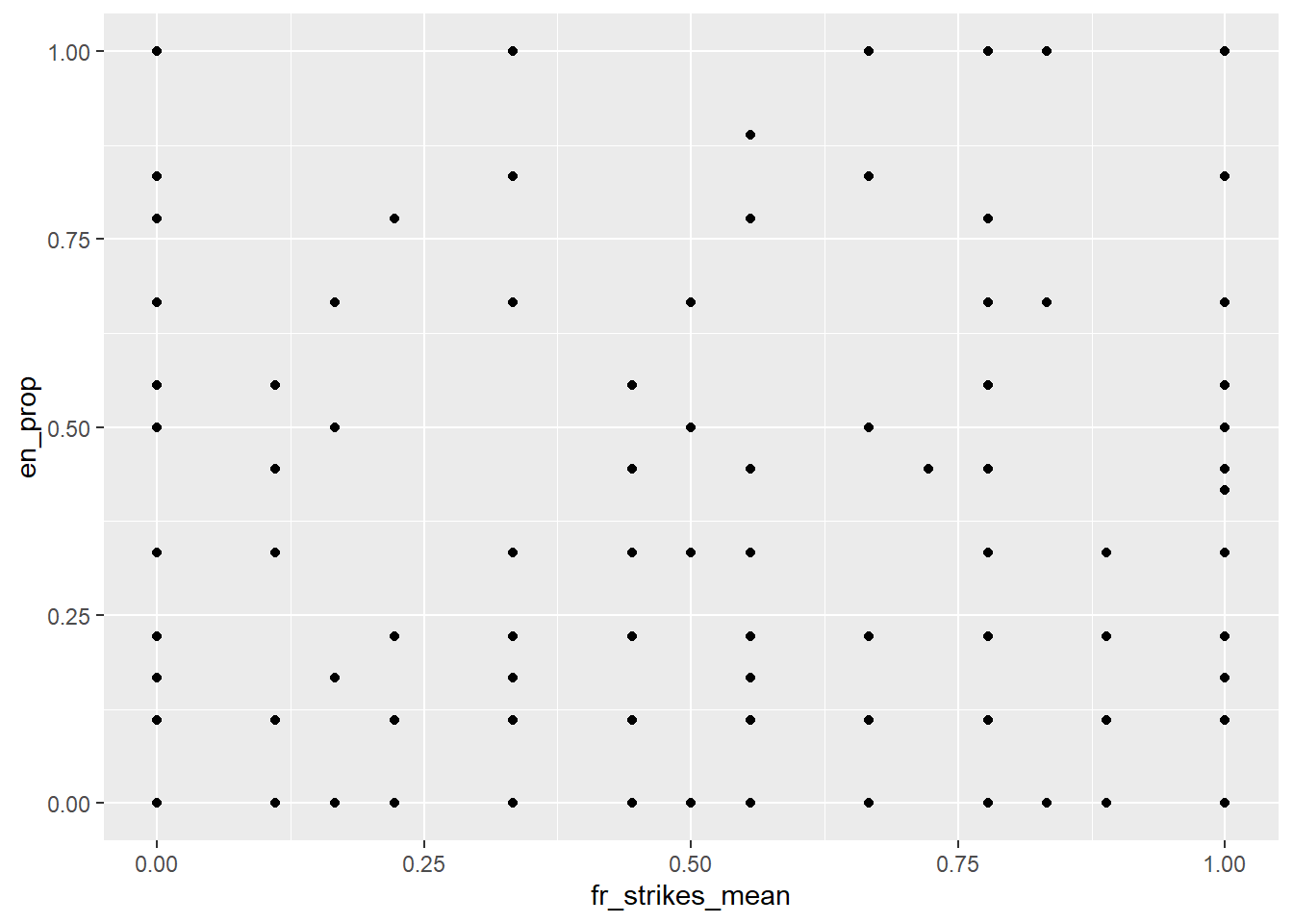 ggplot(data = df[df[["yr"]]==1972,]) + geom_point(mapping = aes(x =fr_strikes_mean, y=en_prop))## Warning: Removed 21 rows containing missing values (geom_point).