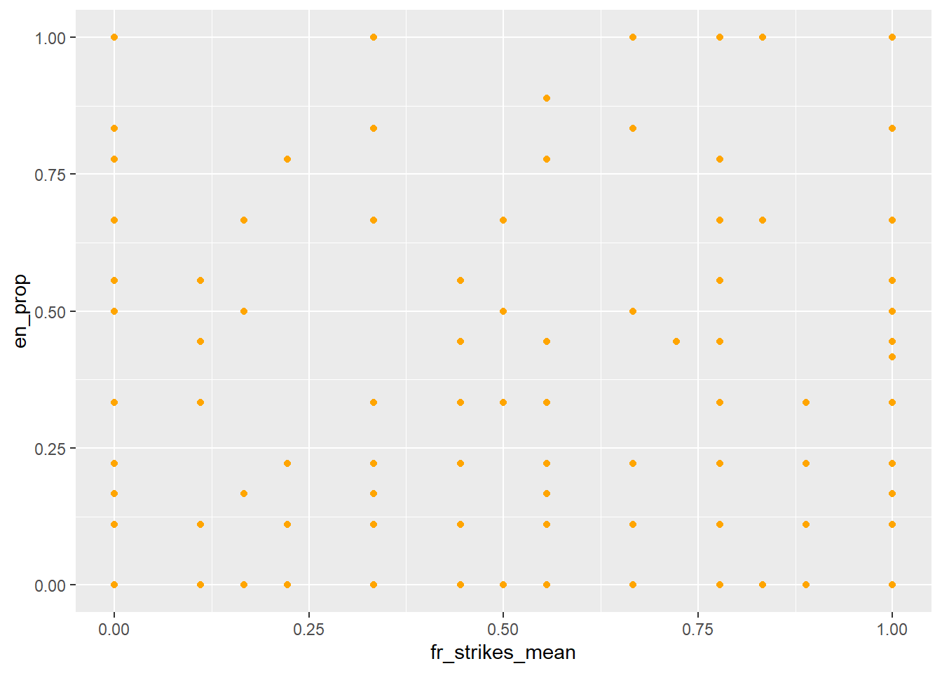 ggplot(data = df[df[["yr"]]==1972,]) + geom_point(mapping = aes(x =fr_strikes_mean, y=en_prop), colour="orange")## Warning: Removed 21 rows containing missing values (geom_point).