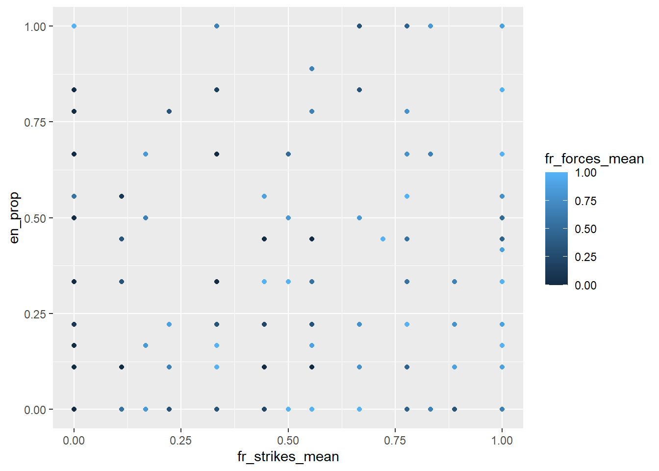 ggplot(data = df[df[["yr"]]==1972,]) + geom_point(mapping = aes(x =fr_strikes_mean, y=en_prop, color = fr_forces_mean))## Warning: Removed 21 rows containing missing values (geom_point).