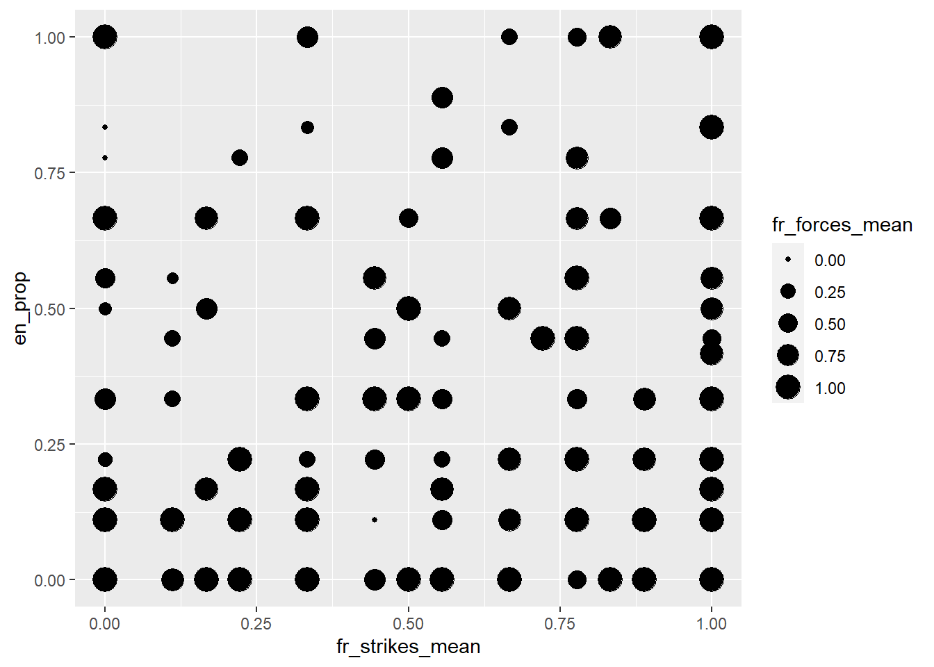 ggplot(data = df[df[["yr"]]==1972,]) + geom_point(mapping = aes(x =fr_strikes_mean, y=en_prop, size = fr_forces_mean))## Warning: Removed 21 rows containing missing values (geom_point).