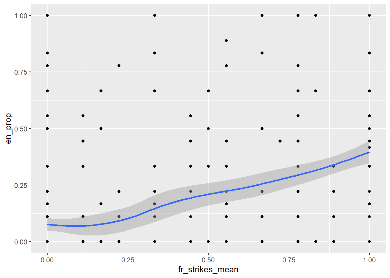 ggplot(data = df[df[["yr"]]==1972,], mapping = aes(x =fr_strikes_mean, y=en_prop)) +