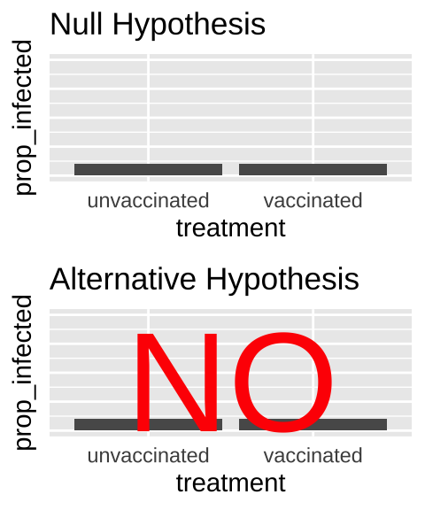 - Null hypotheses: There is NO association between our two categories. e.g. The proportion of people with covid does not differ between the vaccinated and unvaccinated people.