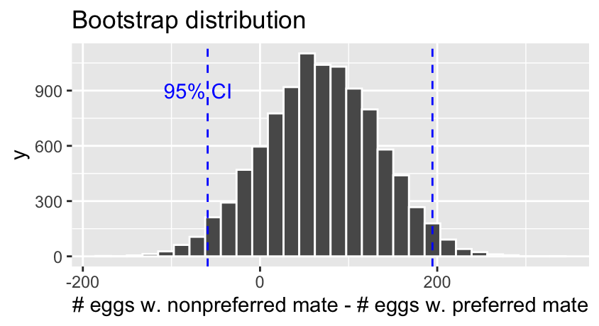 So we quantify uncertainty with the ‘bootstrap’ described in Chapter 5. Specifically, we resample within each treatment with replacement, and