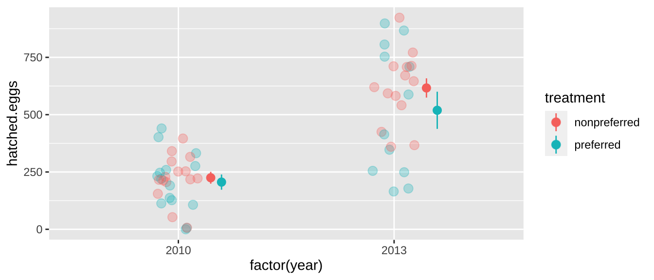 ggplot(aes(x= factor(year), y = hatched.eggs, color = treatment)) +