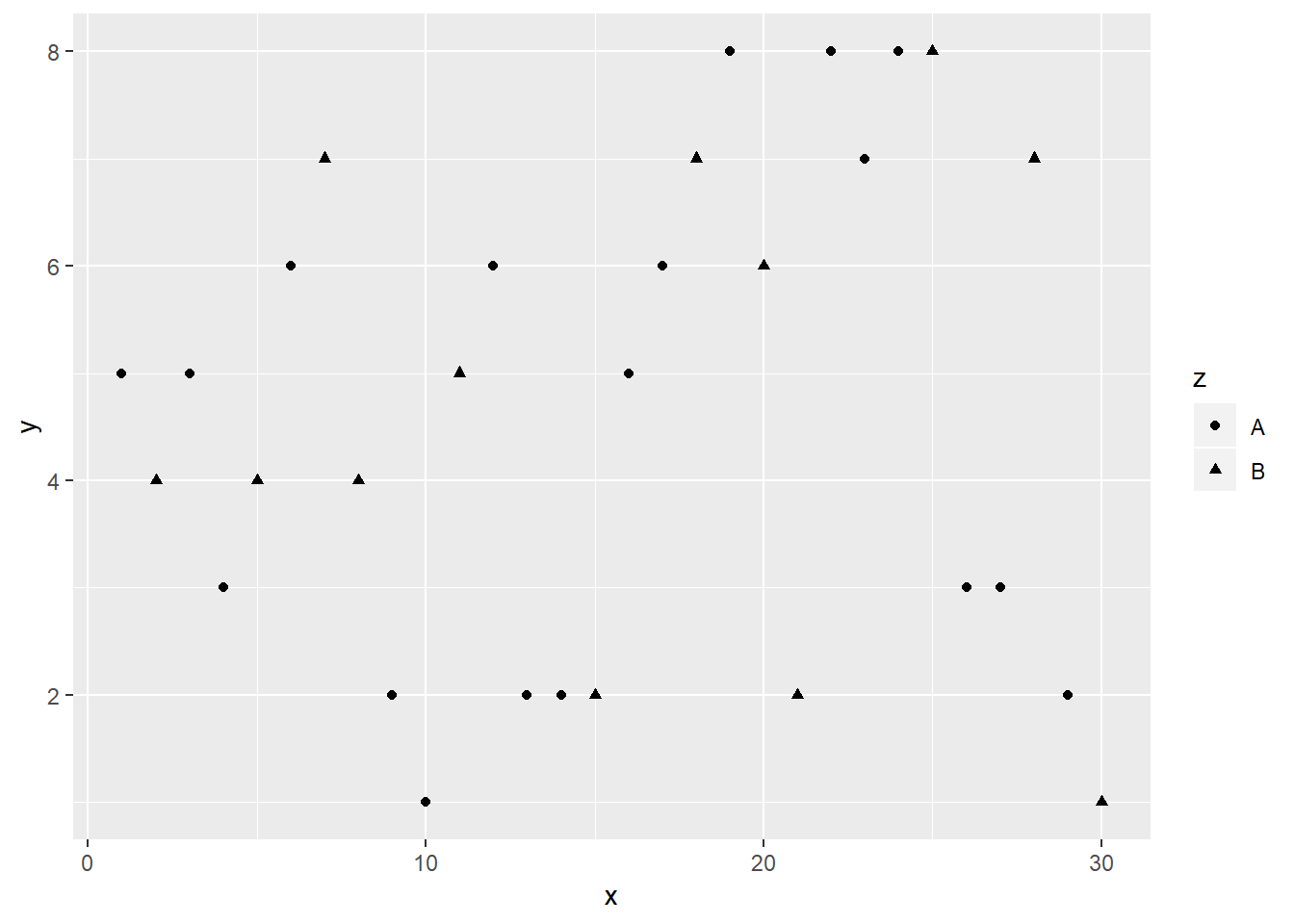 ggplot(df) + aes(x,y, shape=z) + geom_point()