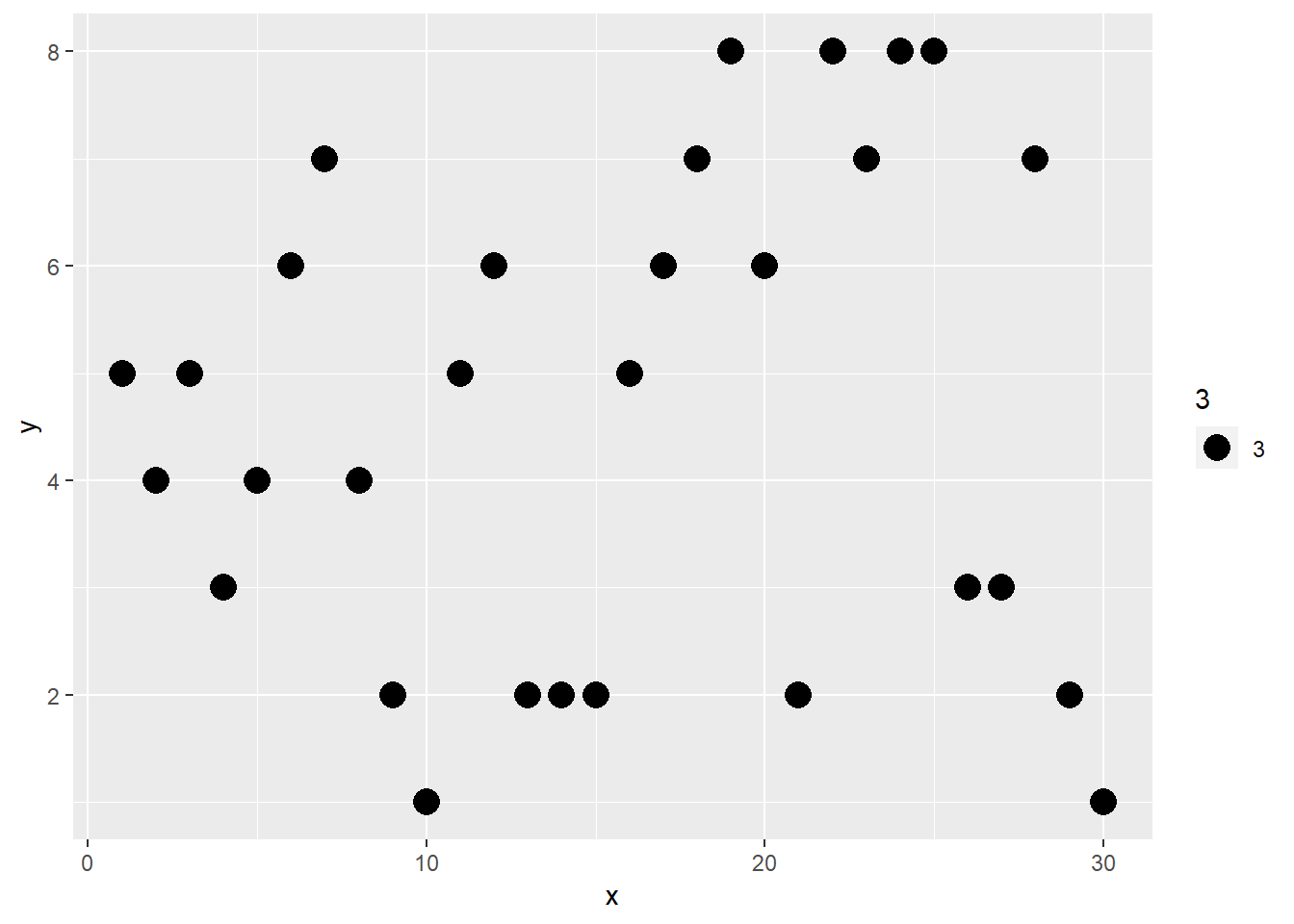 ggplot(df) + aes(x,y, size = 3) + geom_point()