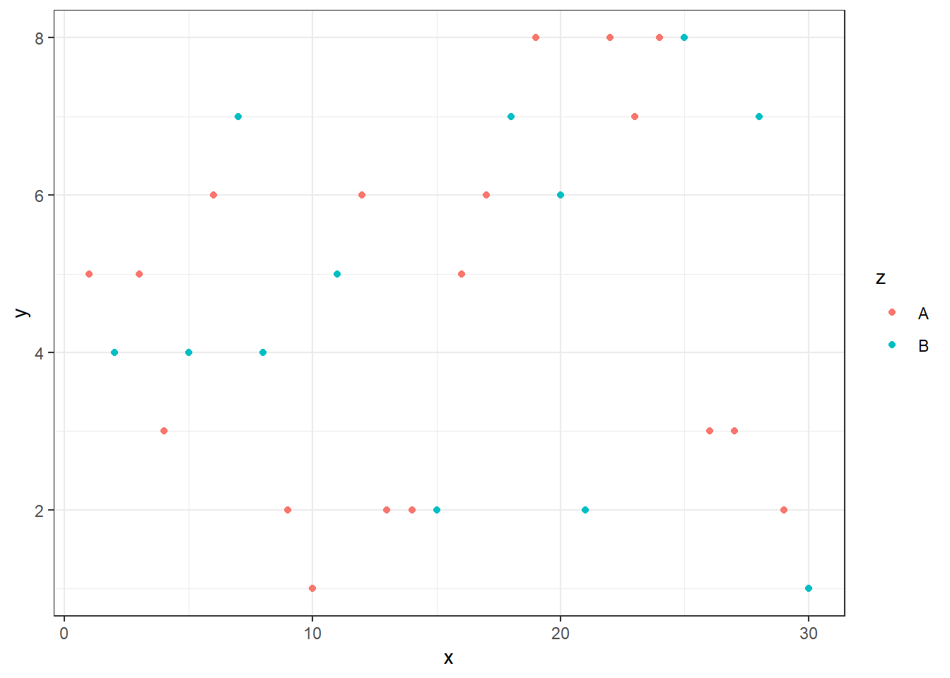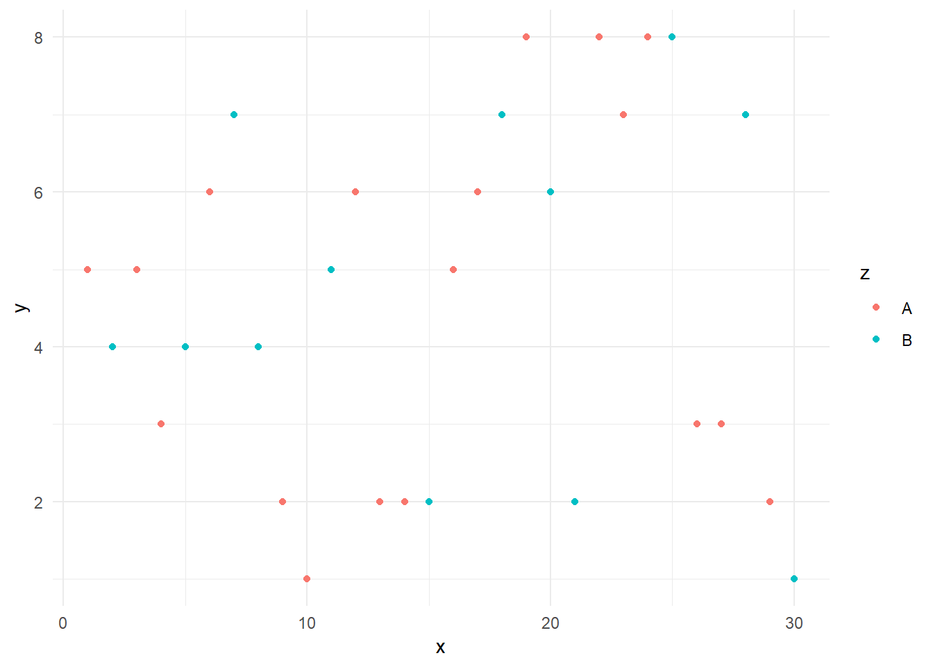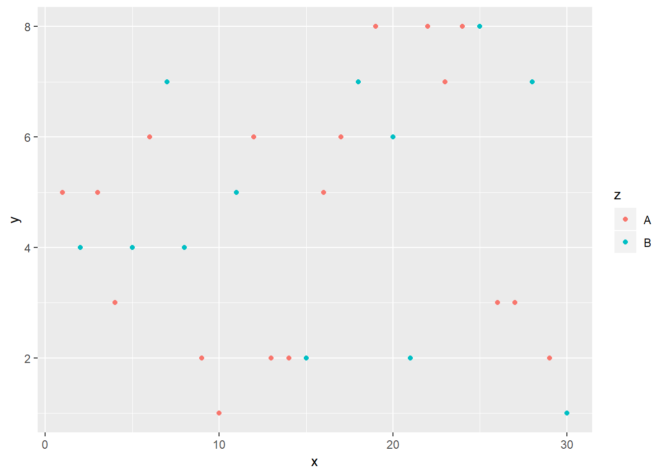 ggplot(df) + aes(x,y, color=z)+ geom_point() +