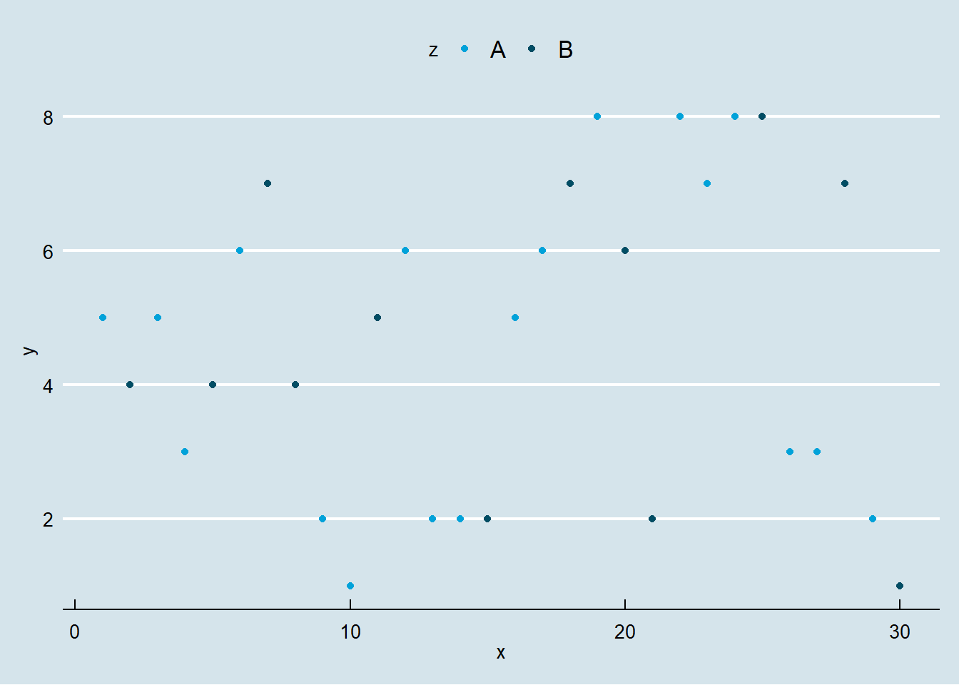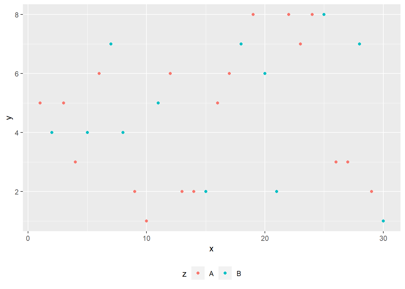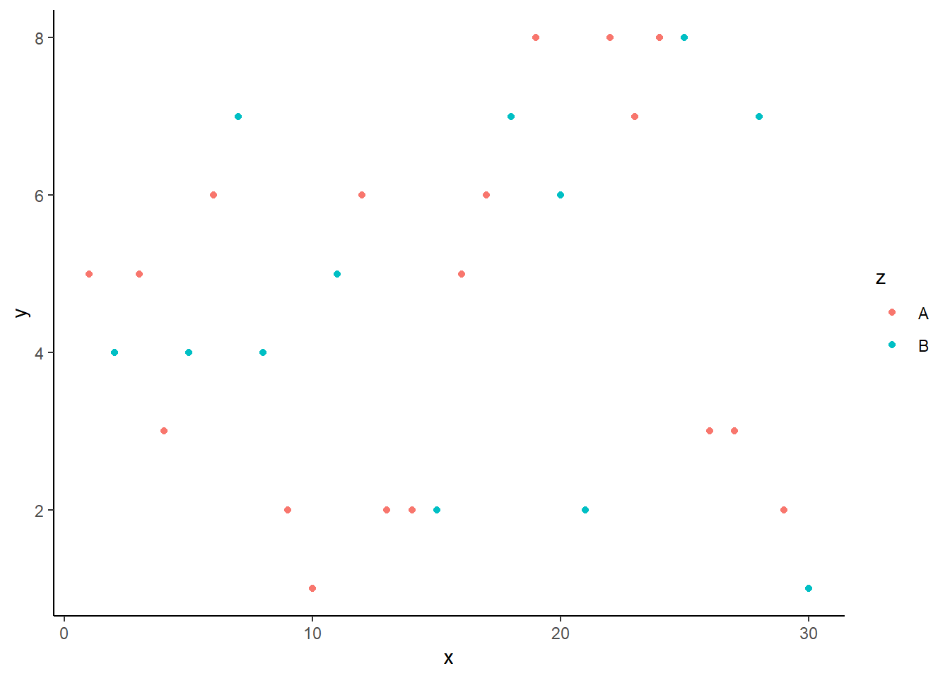 ggplot(df) + aes(x,y, color=z)+ geom_point() +