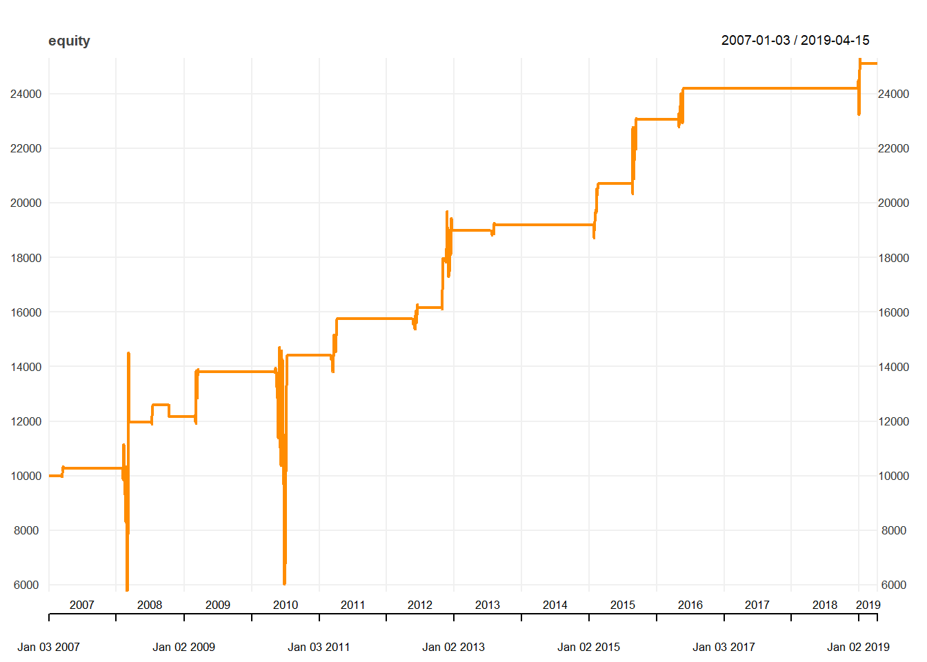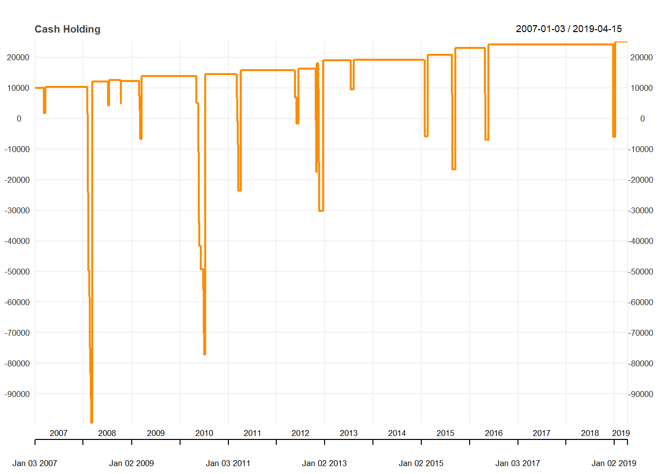 cash[1:(day+1)] <- 10000 Trading signal is based on simple RSI: