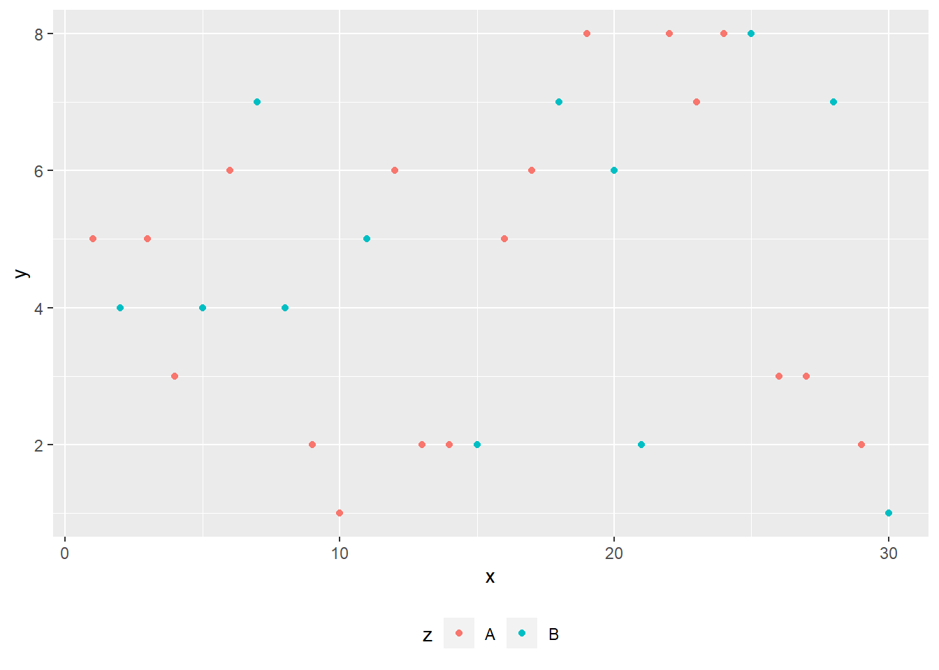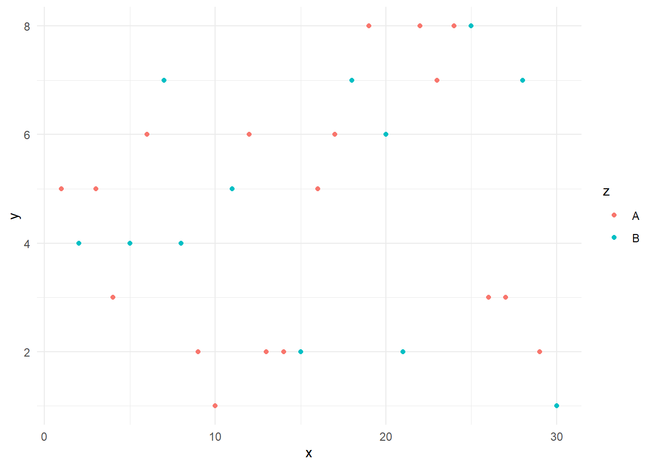 ggplot(df) +aes(x,y, color=z) + geom_point()