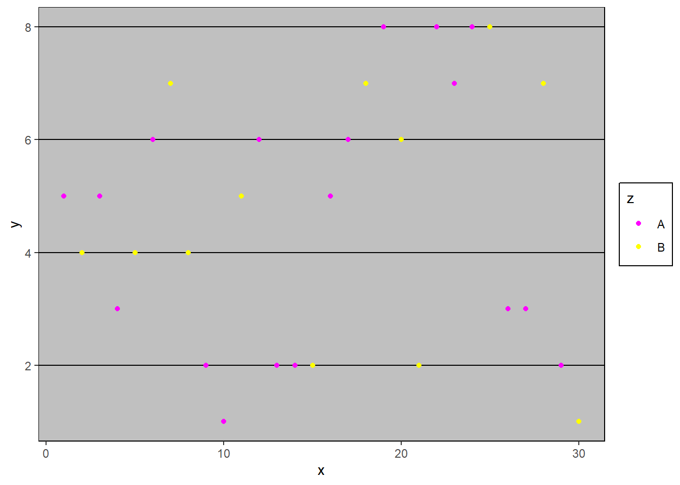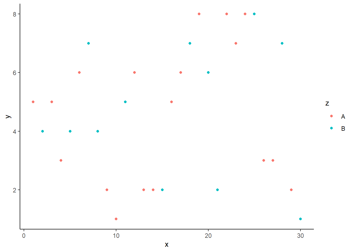 ggplot(df) + aes(x,y, color=z)+ geom_point() +