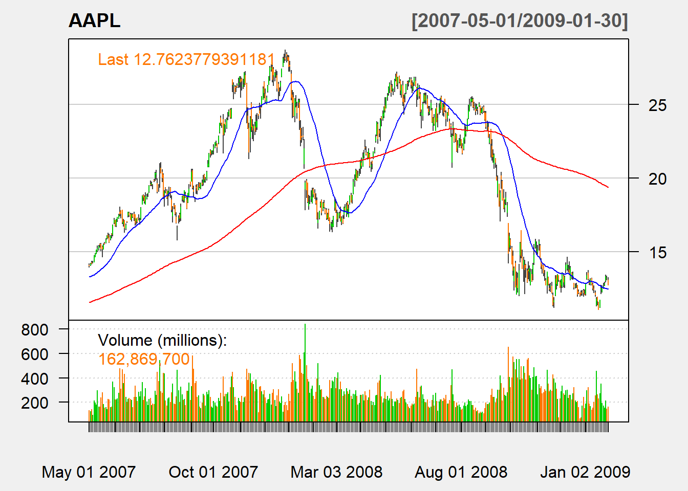Sell signal arrises when a short-run SMA crosses from above to above a long-run SMA.
