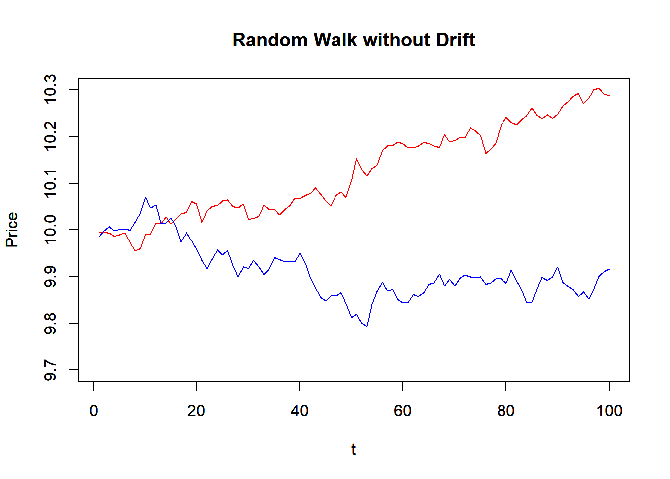 \[ X_t = x_0 + t \mu + z_t \] where \(\mu\) is the drift and \(z_t\) are i.i.d standardized normal random variables.