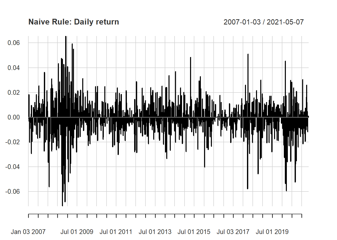 Here we create trading signal based on simple filter rule. Recall that simple filter rule suggests buying when the price increases a lot compared to the yesterday price: \[\begin{align*} \text{Buy}&:\frac{P_t}{P_{t-1}}>1+\delta \\ \end{align*}\] where \(P_t\) is the closing price at time \(t\) and \(\delta>0\) is an arbitrary threshold