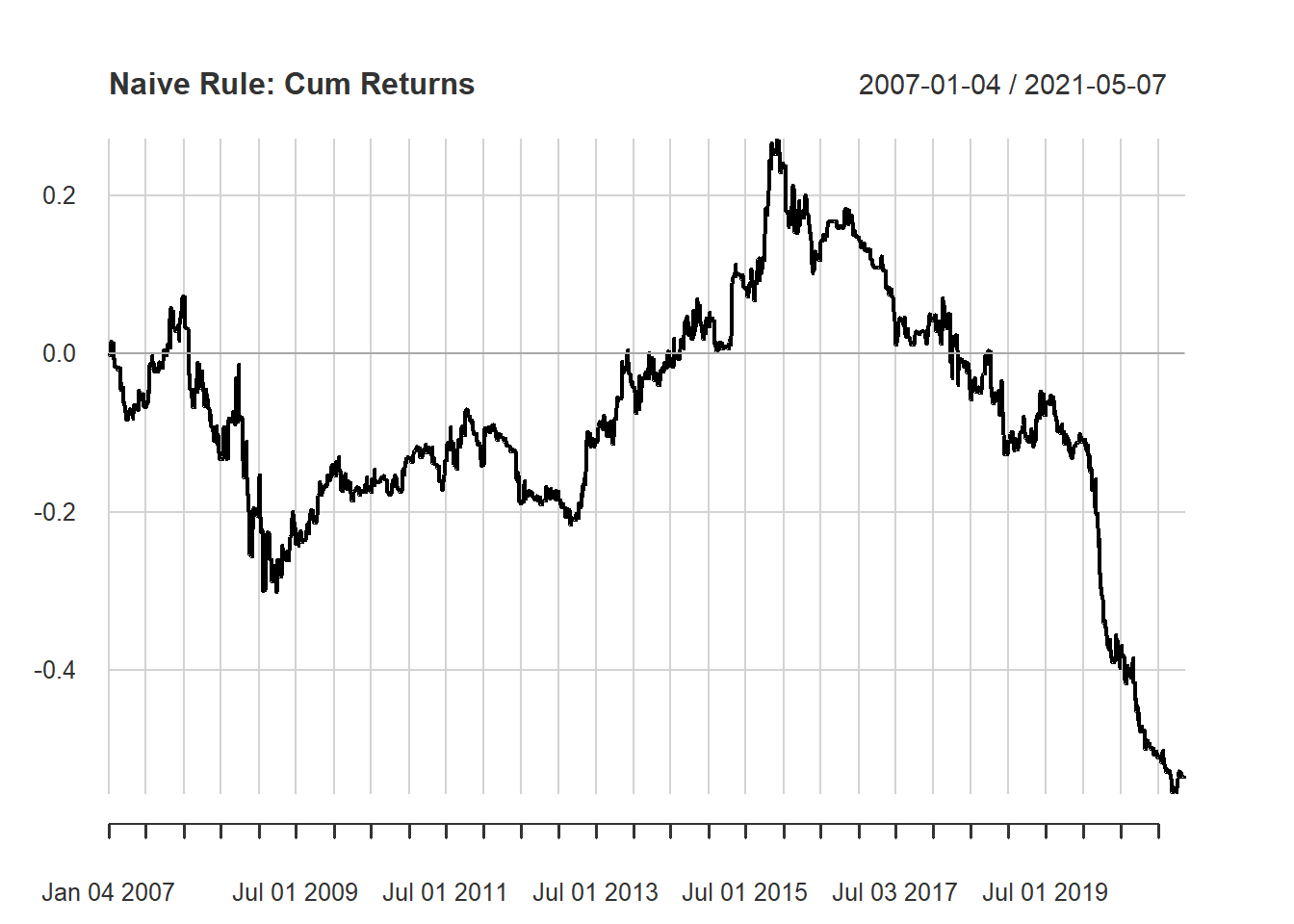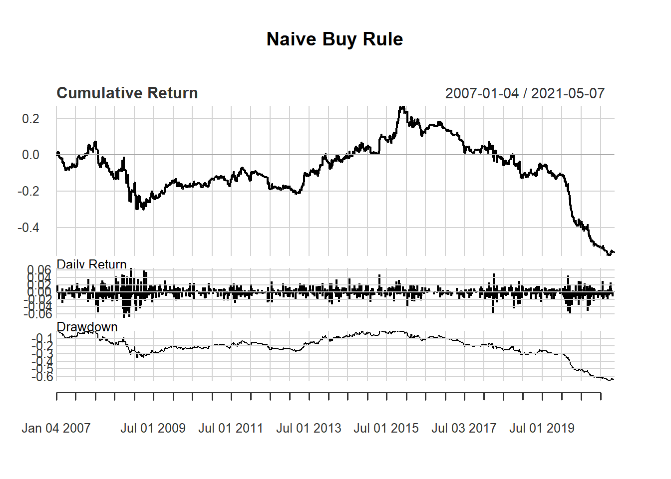 The function chart.CumReturns is a line chart of cumulative (net) return. The default option is in geometric style: \[Cum.Return_{t}=wealth.index_t-1\] where \(R_t\) is return of day \(t\) and \(wealth.index_t =(1+R_1)\times...\times(1+R_t)\). When it is positive, there is a profit. Simialrly, when it is negative, there is a loss.