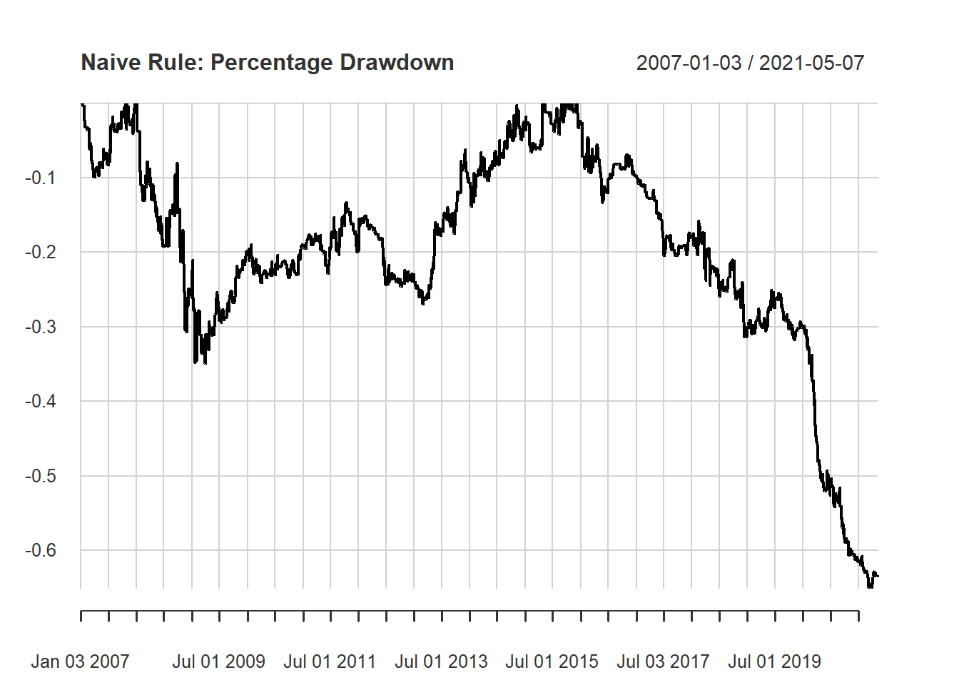 The function chart.Drawdown is a line chart of percentage drawndown. Histroical drawdown is the current distance from the historical maximum value. It is a measure of how risky of the investment strategy. In formula, we have \[Drawdown_t=wealth.index_t-hist.high_t\] where \(hist.high_t=max\{wealth.index_1,...,wealth.index_t\}\) Hence, percentage drawdown is \[Percentage.Drawdown_t=\frac{wealth.index_t}{hist.high_t}-1\]