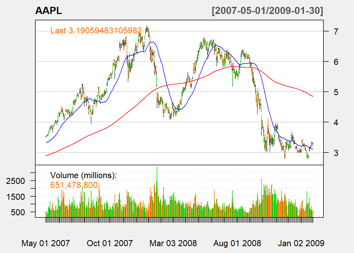 Sell signal arrises when a short-run SMA crosses from above to above a long-run SMA.